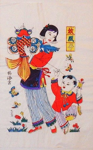 YangJiaBu 2000 ca. 22.5 X 33.5 cm Text: "Fang FengZheng" ('Drachensteigen') links: "Heng XingYi Dian" (Herausgeber') auf Drachen: "MinGuo-AnChun" ('Friede dem Volk') |