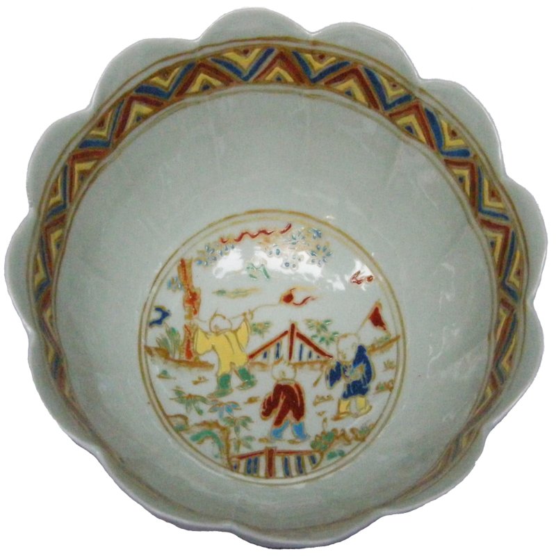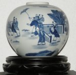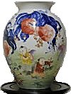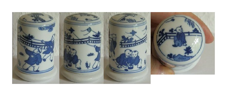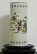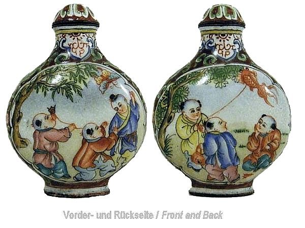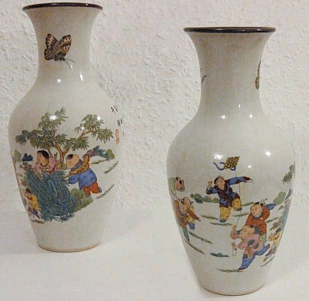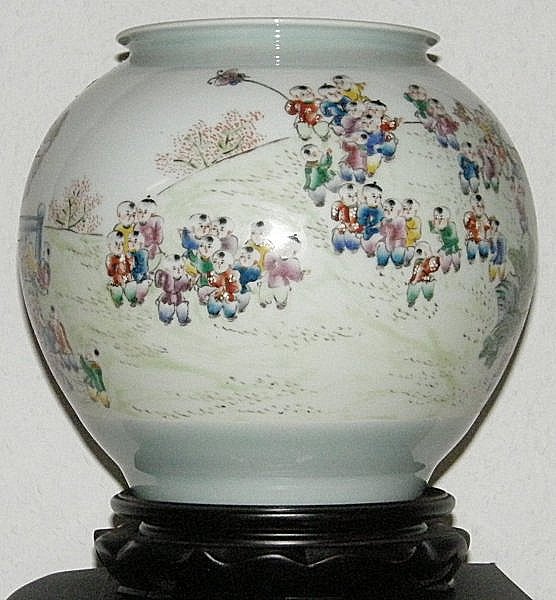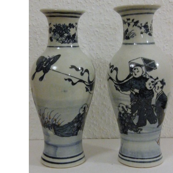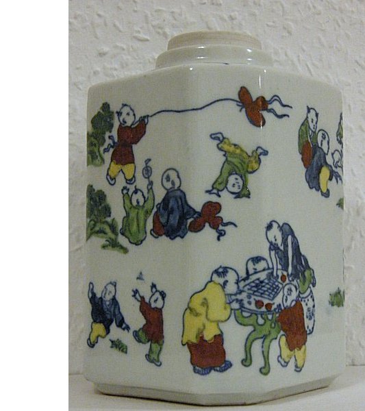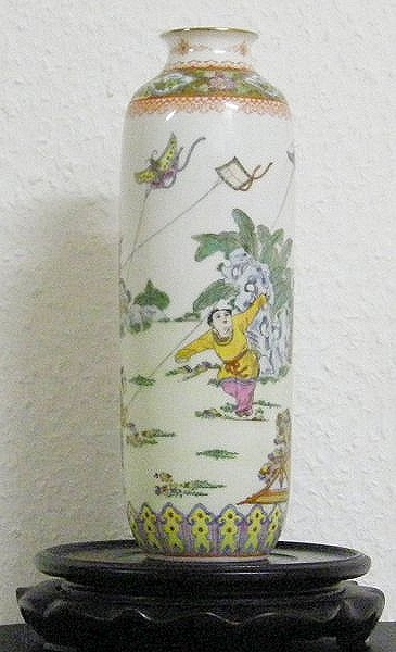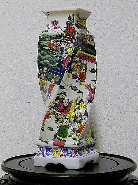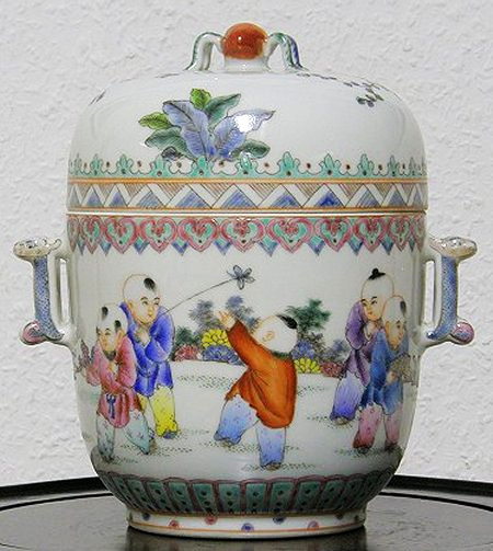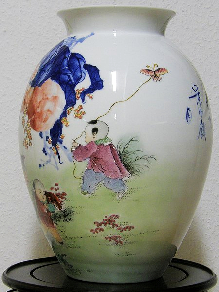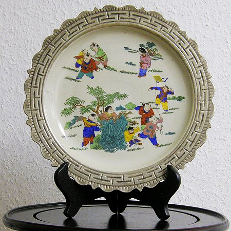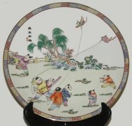 China is regarded as the cradle of porcelain manufacturing, thus porcelain is often named 'china ware'. The manufacturing process of porcelain was first developed in the Chinese Empire during Eastern Han Dynasty (201-220 AD). The production of materials and methods were kept secret for a long time. In October 1708, the German alchemist Johann Friedrich Boettger, whilst in search for producing gold with the help of alchemical experiments, happend to discover the manufacturing process of porcelain in a secret laboratory of the Saxonian/Polish King. Images of playing children, especially boys, are a frequent subject of Chinese painting. The more children to bee seen, the more valuable the piece of art. The images of "One Hundred Children" is a classic configuration ("BaiZi"). Also in conjunction with New Year's Pictures (NianHua), you will find notorious multitudes of appropriate images. You will find boys flying kites on vases, plates and other kind of pottery. Some examples are to bee seen in my little online collection (see below). |