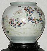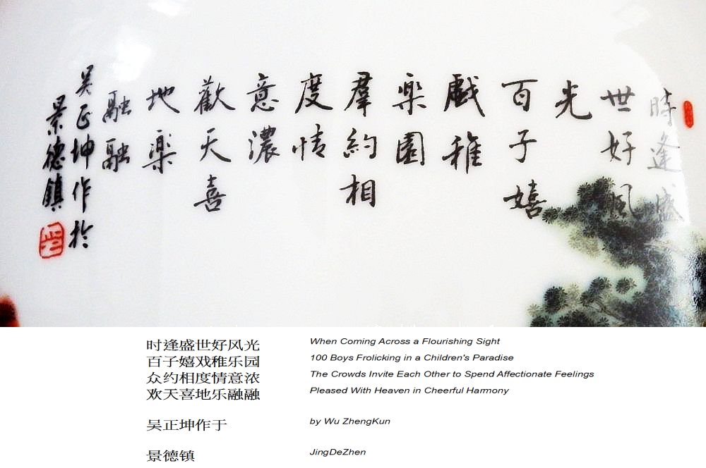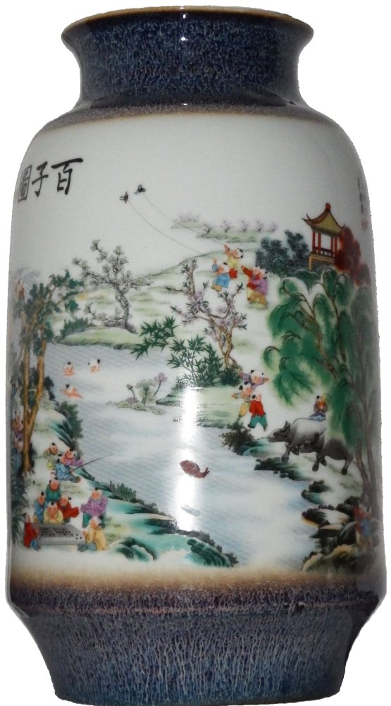BaiZiTu 100 Kinder BaiZiTu (One Hundred Boys) Vase / Vase Porzellan / porcelain (JingDeZhen) Rueckseite: Gedicht von Wu ZhengKun / Back: Poem by Wu ZhengKun Wulst, oben (aussen) 16.3cm Bauch 23.5cm Basis 18.0cm GuiYang 2016 |