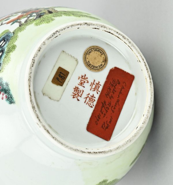 三孩放飞 Drei Drachen steigende Kinder Three Children Playing Kites Vase / Vase / 花瓶 Porzellan / Porcelain / 瓷器 Hoehe / Hight / 度为 30.5cm Qing, 19. Jahrhundert Qing, 19th Century 清代,19 世纪 Stempel / Marked / 制造标志 ShenDe Tang Produkt / ShenDe Tang Made / 慎德堂制 Drei Kinder scharen sich um einen BaGua Drachen. Ein Drachen mit dem Zeichen fuer "Langes Leben" steht ueber ihnen (Rueckseite, oben) Three children gather around a BaGua kite. A kite with the character for “long life” flies above them (upper back) 三孩子围着一条八卦风筝。他们头顶上矗立着一条龙,上面有 “长寿 ”的标志 Niederlande / Netherlands / 荷兰 2025 |