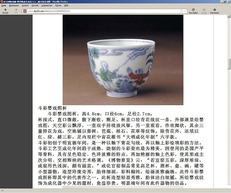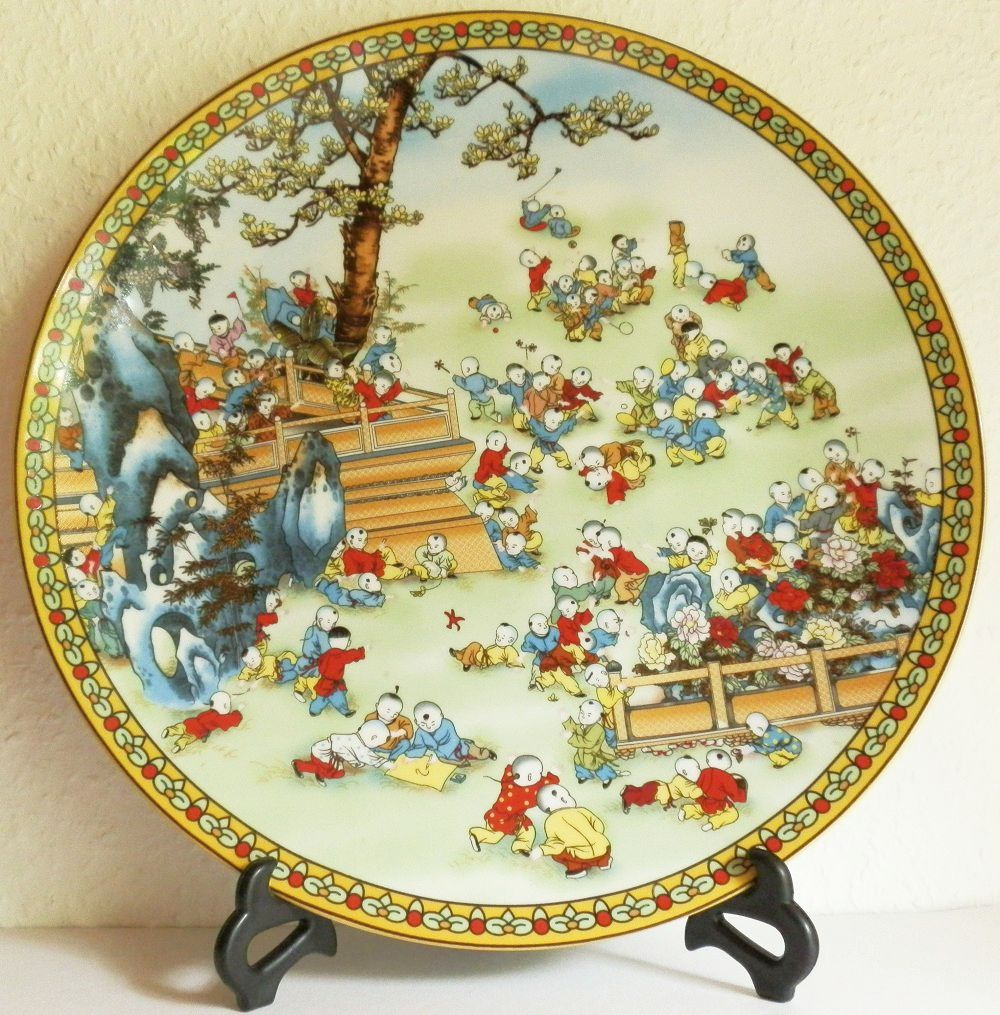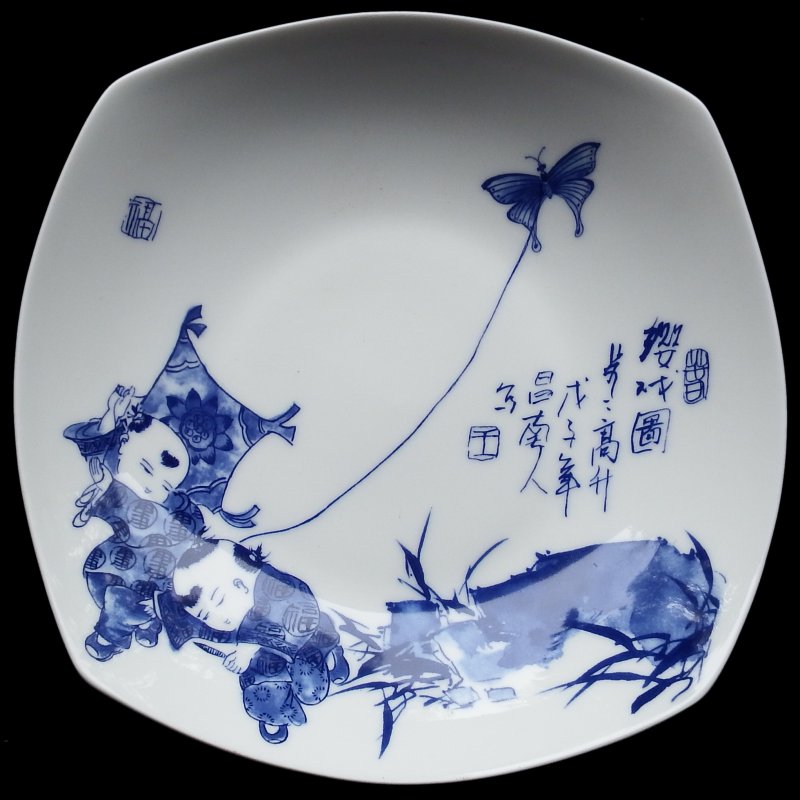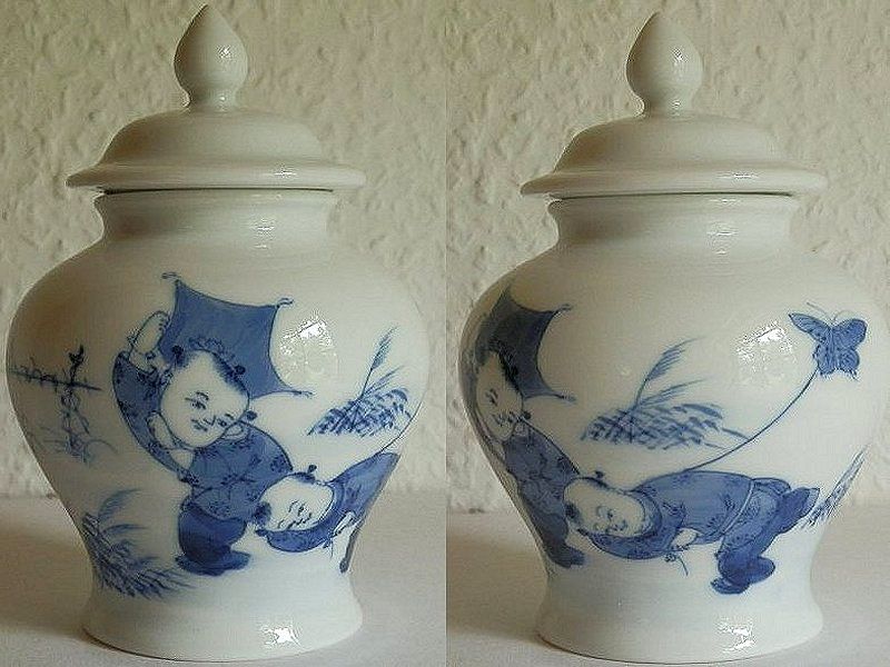 China gilt als Wiege der Porzellan-Herstellung. Der Herstellungsprozess von Porzellan wurde zunaechst im Kaiserreich China in der Oestlichen Han-Dynastie (201-220 v.u.Z.) entwickelt. Die Herstellungsmaterialien und -methoden wurden lange Zeit geheim gehalten. Im Oktober 1708 gelang Johann Friedrich Boettger am Hof des Saechsischen / Polnischen Koenigs (August der Starke) im Rahmen geheimer alchemistischer Versuche zur Herstellung von Gold, zufaellig auch die Herstellung von Porzellan. Darstellungen von spielenden Kindern, vornehmlich Jungen, sind ein hauefiges Sujet Chinesischer Malerei. Hier gilt, je mehr Kinder abgebildet sind, desto wertvoller. Die Darstellungen von "Einhundert Kindern" ist eine klassische Konfiguration ("BaiZi"). Auch im Zusammenhang mit Neujahrs-Darstellungen (NianHua) finden sich diese Bilder. So natuerlich auch auf Vasen, Tellern und anderer Keramik mit Abbildungen von drachenfliegenden Kindern. Einige Beispiele sind hier auf dieser Webseite in meiner kleinen Online-Sammlung zu finden (siehe unten). _________________________________________________