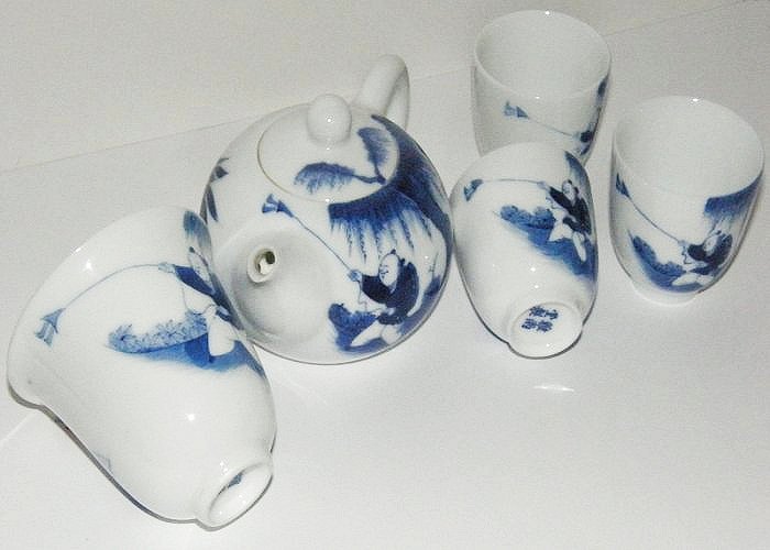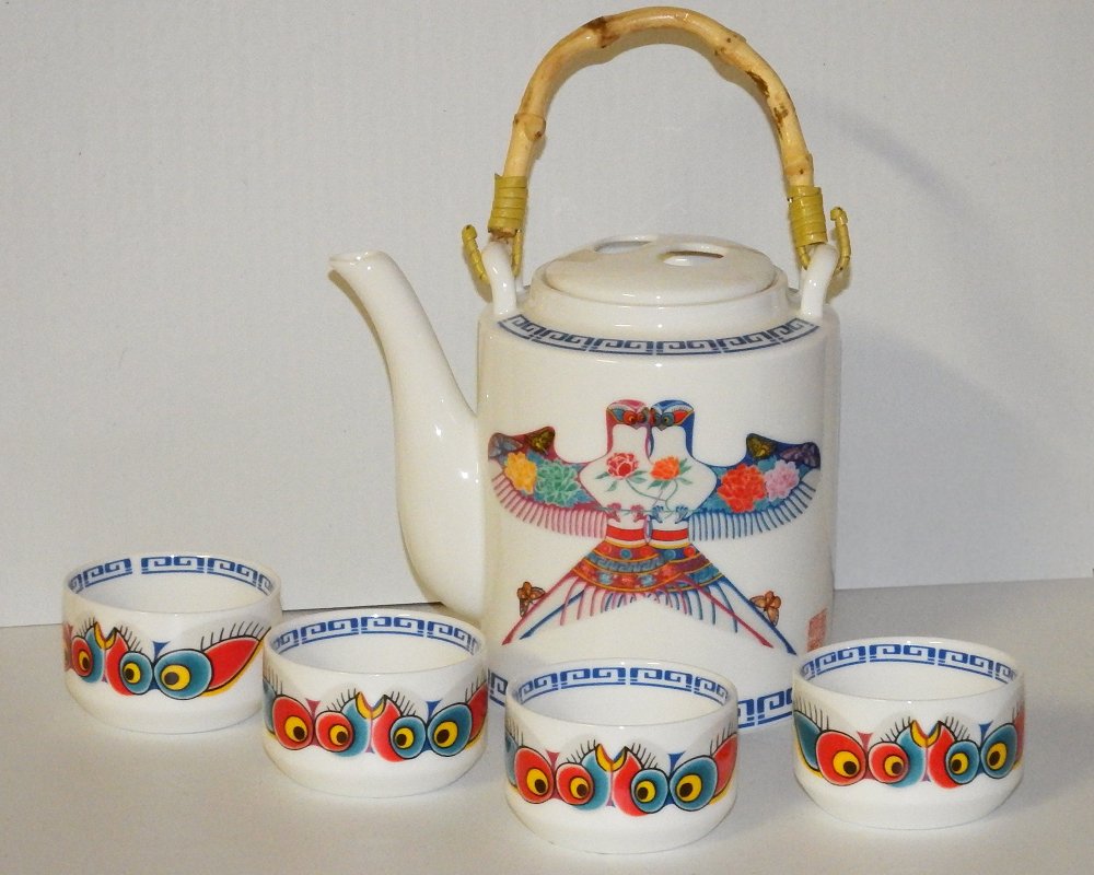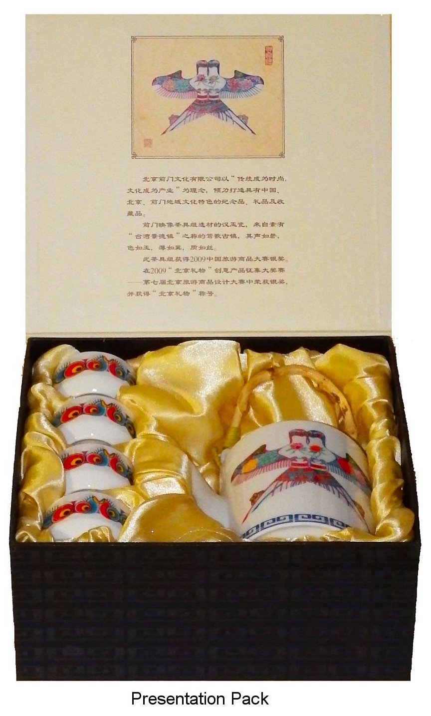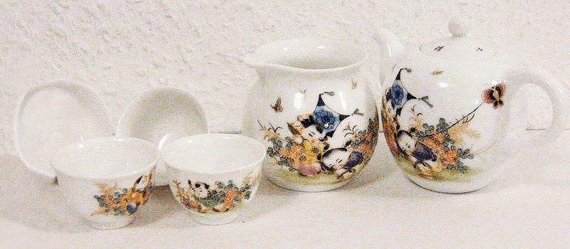 Teeservice Hochzeits-Schwalben-Paerchen Porzellan (BeiJing QianMen) Tea Set Wedding-Swallow Couple porcelain (BeiJing QianMen) 10.0 x 12.0 cm (Kanne, mit Deckel) (pot with lid) 7.6 x 7.5 cm (Schaelchen) (small bowl) BeiJing 2009 |