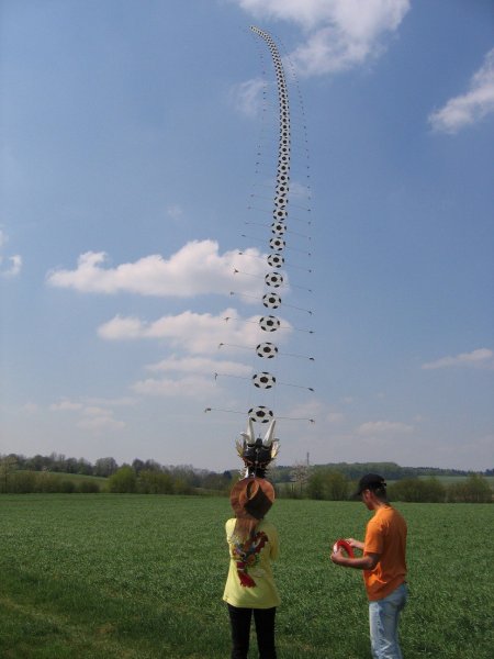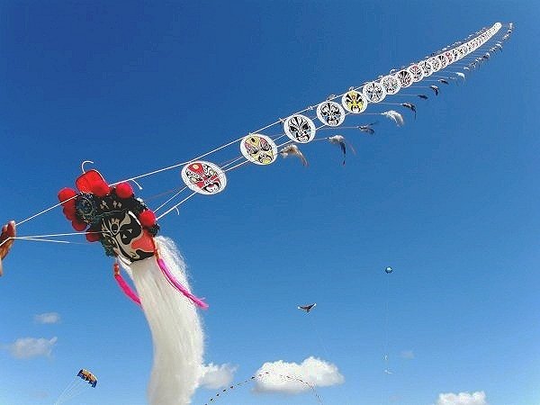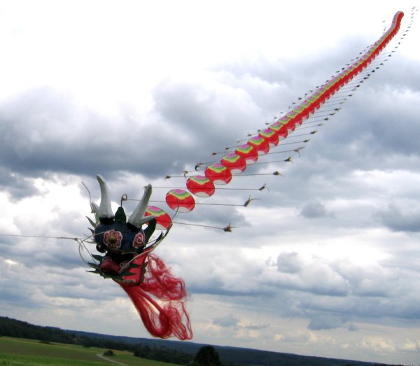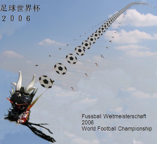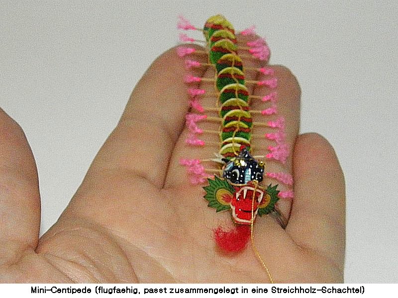 Kuenstlerische Merkmale des WeiFang Centipeden DrachenDer Artikel wurde von der entsprechenden Chinesisch-sprachigen Webseite uebernommen. Die "blumige Ausdrucksweise" des Chinesischen Original-Textes wurde weitgehend beibehalten. Der Centipeden-Drachen ist ein hervorragender Vertreter der Drachen WeiFangs. Im Chinesischen Original-Text (LongTou WuGong, 龙头蜈蚣) wird er als "Drachen-Kopf Tausendfuessler" bezeichnet. Mit seiner einzigartigen Themenvielfalt, den ausdrucksstarken und lebendigen kuenstlerischen Formen, der aufwendigen Handwerkskunst als auch seinen unverwechselbaren Farben, unterstreicht er die kuenstlerischen Eigenschaften dieses typischen WeiFang-Drachens. Er war schon immer ein Lieblingsobjekt von Chinesischen und auslaendischen Drachenfreunden. In der traditionellen Vorstellungswelt Chinas ist der Drache eine Art glueckverheissendes Wesen, das in die Wolken entschwebt und auf ihnen reitet, Wind und Regen hervorruft, und so den Menschen Vorteile bringen kann. Der Drache symbolisiert die Wuerde der Chinesischen Nation, und WeiFangs Drachenkopf-Tausendfuessler-Drachen ist die Verkoerperung dieses traditionellen Glaubens und Denkens. In der langen kuenstlerischen Tradition WeiFangs, mit dem Streben nach einem besseren Leben, und mit einer reichen kuenstlerischen Vorstellungskraft, wurden der Drachen-Kopf und der Tausendfuessler-Koerper harmonisch miteinander verbundenn, und der ehemalige reine Tausendfuessler-Drachen wurde so zum Gesamtkunstwerk als Centipeden-Drache. Das gleiche gilt fuer den nach wie vor existierenden reinen Tausendfuessler-Drachen als Drachenkette, aber die kuenstlerische Gestaltung wurde ausgefeilter und moderner. Aus dieser Sicht ist der ausgearbeitete Drachenkopf-Tausendfuessler-Drachen (hier: 'Centipede') ein romantisches Kunst-Thema der Drachenbauer WeiFangs. Es ist diese Art von Kreation, die der Geschichte des Chinesischen Drachenbaus ein einzigartiges Sujet hinzufuegt hat, und eine beispiellose kuenstlerische Form in der Welt der Fessel-Drachen schuf. Die Verbindung von Drachenkopfes und Tausendfuessler als neuartiges Thema der Drachenbau-Kunst, spiegelt nicht nur die reichen kreativen Talente der Kuenstler WeiFangs wider, sondern verweist auch auf bestimmte Vorstellungen und dem starken Wunsch aller Menschen nach einem schoenen Leben. Das Chinesische Volk hat Drachen immer als eines der hoechsten Wesen angesehen. Tausendfuessler gelten als Nachkommen der Drachen in der Vorstellungswelt der Menschen WeiFangs. Daher uebernehmen Drachenkuenstler die kuenstlerische Fuehrung und verwendeten den reinen Tausendfuessler als Koerper, um dem Drachen als mythisches Wesen seine spezifische Drachen-Form zu geben. Die Menschen bewundern entweder die Majestaet und Vitalitaet des Drachen oder bitten ihn, dass er die Welt segnen moege, um jedes Jahr gluecklich zu bestehen, und ganzjaehrig Glueck und Frieden zu finden. Kurz gesagt, der Drachenkopf-Tausendfuessler Drachen oder 'Centipede' entspricht der Erwartungshaltung des traditionellen Konzeptes der Gluecksverheissung der Menschen, und wird deshalb von allen akzeptiert. Lebendig wirkende Form, ausgefeilte Farbgebung und Technik, Helle Farben, starker Kontrasteffekt Farbe ist ein wichtiges Symbol, das die Merkmale der bildenden Kunst zwischen verschiedenen ethnischen Gruppierungen und oertlich unterschiedlichen Gebieten in China unterscheidet. Sie unterstreicht das Lokalkolorit der Volkskunst. In Bezug auf die Malerei bildeten WeiFang-Drachen aus historischen Gruenden zwei grundlegende Kategorien. Eine ist der traditionelle Chinesische Malstil der Kunstverstaendigen und Kulturschaffenden. Ein Malstil der erst ein seit der Neuzeit gebildetes Genre der Drachenmalkunst darstellt. Der Stil hat einzigartige Eigenschaften in der Malerei und einen hohen Betrachtungswert. Er hat viele Auszeichnungen fuer WeiFang bei Drachenwettbewerben erhalten. Der andere ist der farbenfrohe traditionelle Volks-Malstil. Der Drachenkopf-Tausendfuessler-Drachen ist der Vertreter dieser traditionellen Drachen Darstellung- und Mal-Stils. Die Bildung seiner spezifischen Farbmgebung steht in direktem Zusammenhang mit volkstuemlichen Bildern, Grafiken und Neujahrs-Bildern WeiFangs. Besonders nach der Qing-Dynastie bluehte die Holzdruck-Kunst der Neujahrsbilder Manufaktur aus dem Drachen-Dorf YangJiaBu auf, und gewann eine hohe Popularitaet, die sich auch auf die Farbgebung der Centipeden-Drachen auswirkte, und so einen spezifischen lokalen Malstil schuf, der sich im so genannten "Viel Rot-Viel-Gruen"-Farbgebung. In Bezug auf die Malerei absorbiert es die Eigenschaften der Farben Rot und Gruen der YangJiaBu Holz-Drucktechnik mit ultramarinen und gelben, weißen und scharlachroten Farben, um einen starken Kontrast zu bilden. Im Kompositionslayout sind die Haupt-Farbblöcke der Holzdrucke dicht gebürstet, was eine kontrastreiche, starke und helle kuenstlerische Atmosphaere erzeugt. Auf diese Weise eignet sich das Bild zum Betrachten aus der Ferne, wie beispielsweise beim Fliegen der Drachen in der Luft. So wirkt das Flug-Bild realistischer und ermoeglicht einen besonderen Raumwahrnehmungseffekt , was seine seit vielen Jahren grosse Beliebtheit erklaert. Mit dem auch von WeiFang nicht ausgenommenen weltweiten auch Drachen-bezogenen Kulturaustausch, wurden viele neue Drachen-Designs nach einem neuen Zeitgeschmack entwickelt. Dieser Vorgang machte auch nicht vor den ehedem hergebrachten traditionellen, volkstuemlichen Drachen halt. So haben einige traditionelle Drachen im Laufe der Zeit neue Farbgebungen erfahren, aber die Drachenkopf-Tausendfuessler-Drachen folgen weiterhin dem Weg der Tradition und haben immer noch die lokale herkoemmliche Farbgebung. Diesen Drachen erfuellen daher immer noch die aesthetischen Beduerfnisse nach unverfaelschtem Brauchtum. ~~~~~~~~~~~~~~~~~~~~~~~~~~~~~~~~~~~~~~~~~~~~~~~~~~~~~~~~~~~~~~~~
