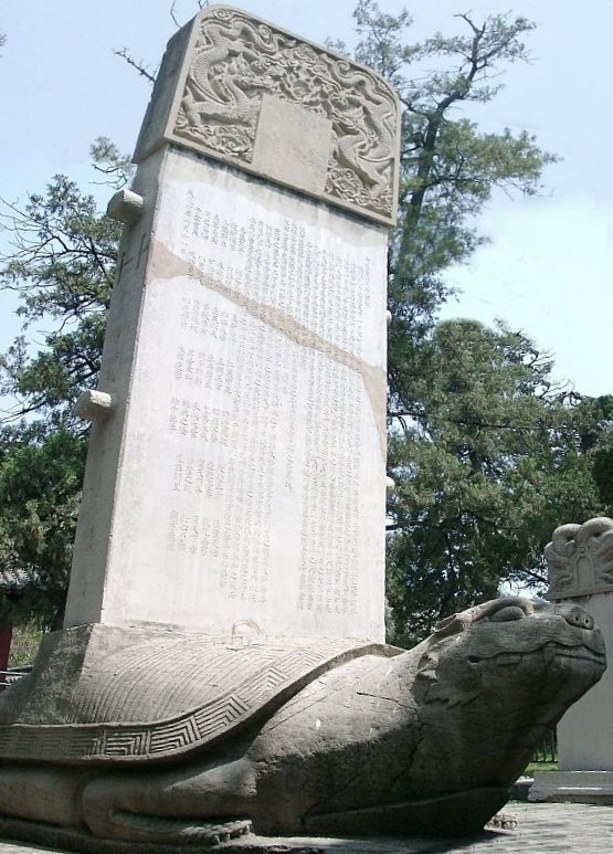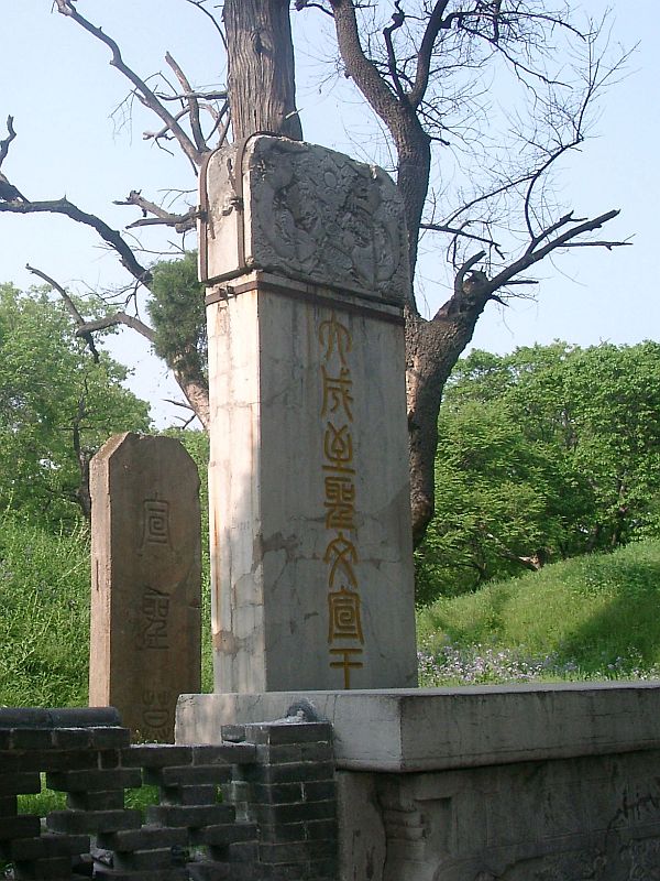 erkennen. Als Ersatz fuer den zerschlagenen Garabstein wurde zunaechst ein kleiner neuer aufgestellte, der heute hinter der restaurierten alten Grab-Stele steht. As part of the "Smash the Four Old Ones" (破四旧, Pò SìJiù) campaign, the Red Guards coming from BeiJing destroyed many temples, treasures of art, bowers, statues and pictures during the Cultural Revolution. The Confucius Temple in QuFu was not spared. The Confucius* burial mound was ransacked, but no "old bones" were found. The grave stele was knocked over and broken. therefore today, the visible upper part is secured by an iron tire. The stelae in the whole compund were screened and, if there were any unwanted clues, they were broken up if necessary. You can still clearly see the traces of the 1966s on various restored stone tableaus. As a replacement for the broken stone, a small new one was erected, which is now behind the restored old grave stele. 作为“破四旧”的一部分,在文化大革命期间,来自北京的红卫兵摧毁了许多寺庙,艺术品,凉亭,雕像和图片。 曲阜的孔庙没有幸免。 孔 子*的墓葬被洗劫一空,但未发现“老骨头”。 墓碑被打倒并折断。 因此,今天,可见的上部由铁胎固定。 筛选了整个组合物中的石碑,如果有不需要的线索,则在必要时将其分解。 你仍然可以在各种修复的石制台面上清楚地看到1966年代的痕迹。 作为破坏的替代品,竖立了一块小的新墓碑,该石现在位于恢复的大旧墓碑后 面。 ___________ * Konfuzius, der Weise der reaktionären Klassen (Verlag fuer fremdsprachige Lieratur, Peking, 1974; komplette Broschüre) Lesenswert! Confucius, the Sage of the Reactionary Classes (Foreign Language Publishers, Beijing, 1974; complete brochure) in German; nevertheless worth reading! 孔子, 反动阶级的圣人 (外文出版社,北京,1974年,完整手册) (德文); 值得一读! |