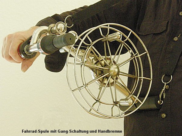 Besondere Spulen Auch Drachenflieger sind auf Exklusivitaet bedacht. Neben der in Voll-Bronze (schon wegen des goldfarbenen Tones!) ausgefuehrten Spule mit Ueber- und Untersetzung und Kugellager, gibt es natuerlich auch noch fuer den Technik-Begeisterten die Fahrrad-Spule mit Gangschaltung und Handbremse. Das abgebildete Exemplar stammt aus dem Drachenbauer-Dorf YangJiaBu, und wurde fuer umgerechnet 20 Euro vom Wagen herunter verkauft. Fuer Chinesische Verhaeltnisse ein teures Vergnuegen, aber man goennt sich ja sonst nichts! ![]() |