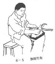 verschiedener Drachenteile benoetigt werden. Traditionell wird haeufig die s.g. "Pump"-Methode verwendet, d.h. der Bearbeiter sitzt, breitet ein dickes Tuch auf den Beinen aus, haelt den Bambus in der linken Hand (bei Rechtshaendern), die Bambushaut ist nach unten gewendet, und die rechte Hand haelt das Messer horizontal. Ziehen Sie den Bambusstreifen mit der linken Hand kraeftig heraus, und das Bambusfleisch wird eine Schicht abgeschabt (siehe Abbildung 6-5). Passen Sie den Winkel und den Druck der Klinge auf den Bambusstreifens entsprechend an, um die Dicke des abzuhobelnden Bambusfleisches zu aendern. Um die eigene Kleidung bei der Verarbeitung von Drachen nicht beschaedigen, arbeitet man sicherer auf einer Werkbank. Daher ist die Verwendung einer Hobelbank zum Abheben von Bambusstreifen eine gaengige Methode geworden. Diese Bambusschneidemethode ist leicht zu beherrschen und die Bearbeitungsgenauigkeit ist relativ hoch. Es wird daher empfohlen, sie zu verwenden. Zusätzlich zu der oben erwaehnten Schneidmethode gibt es auch Holzfeilen zum Bearbeiten (wie z.B. Bambusknoten) und eine Klinge zum Glatthobeln (zur Endbearbeitung). |