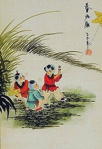 /ChunJie Drei Kinder/Fruehling Three Children / Springtime von / by HUAN Xing (Papier-Tusche / paper-ink) 45X 63cm 2010 (BeiJing) |