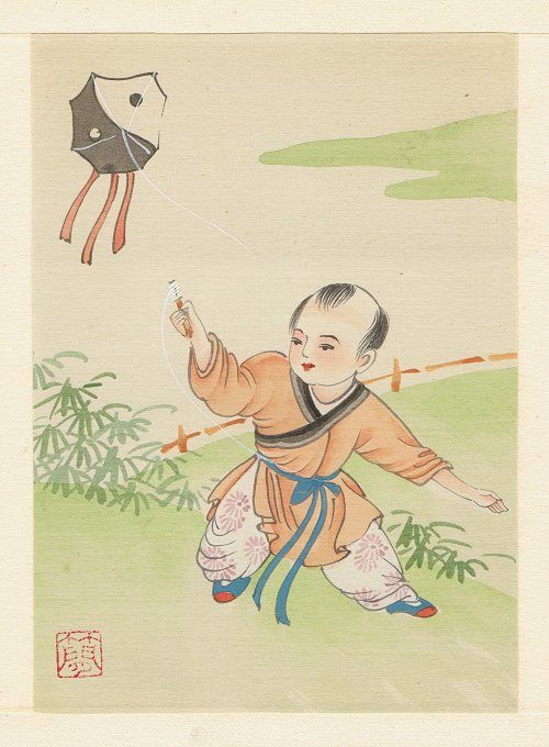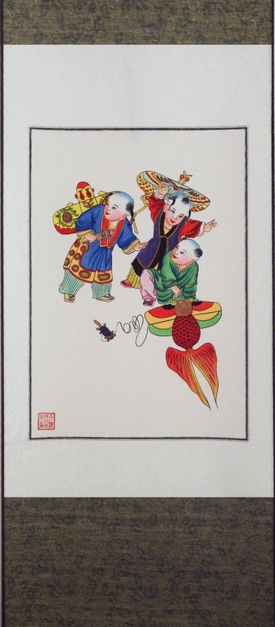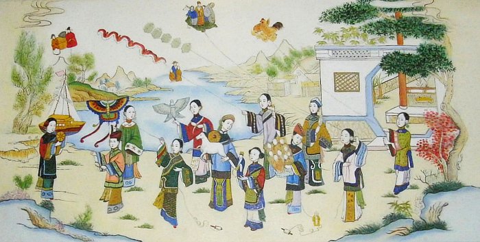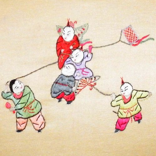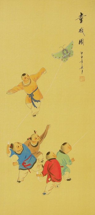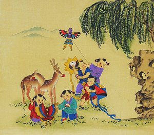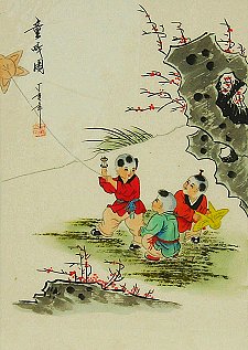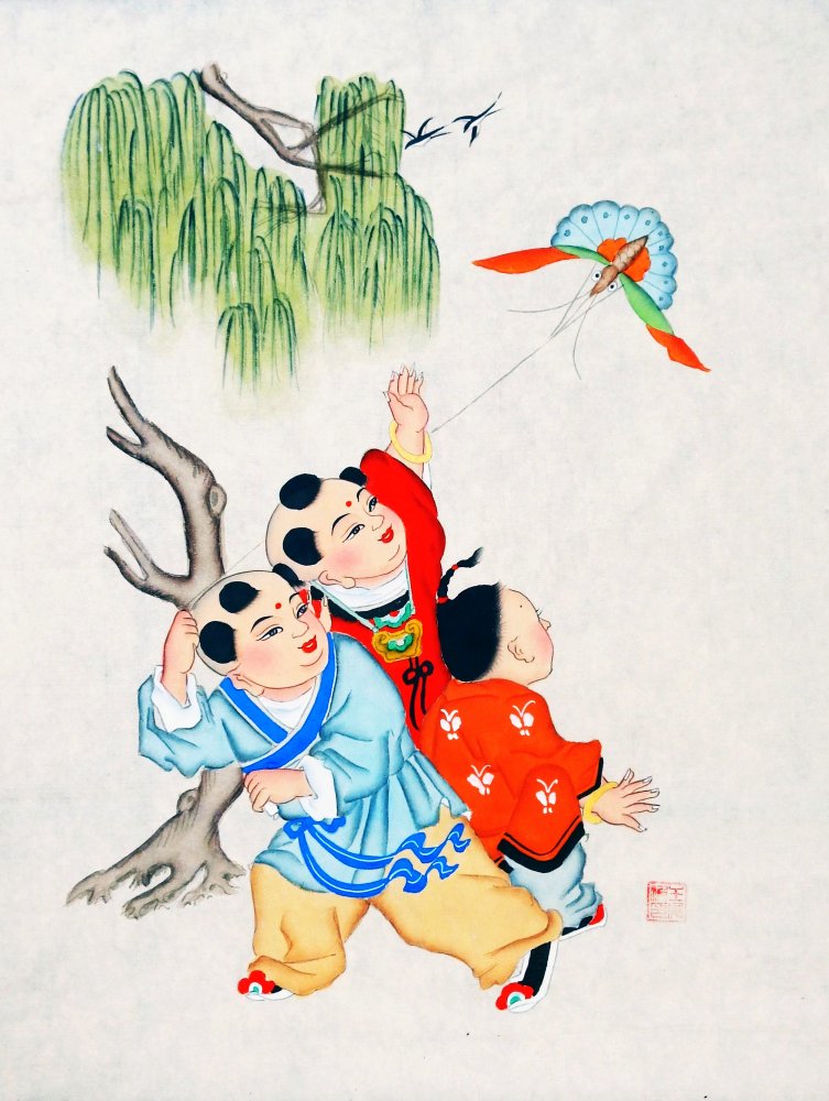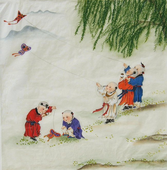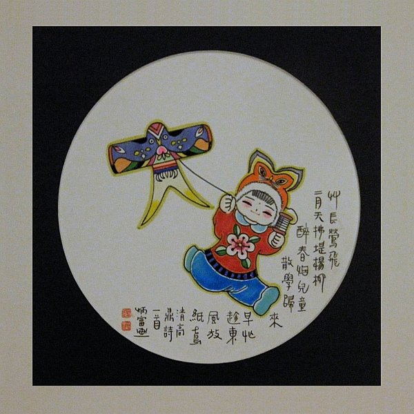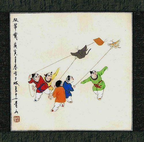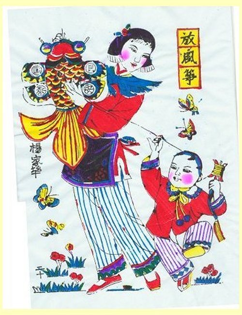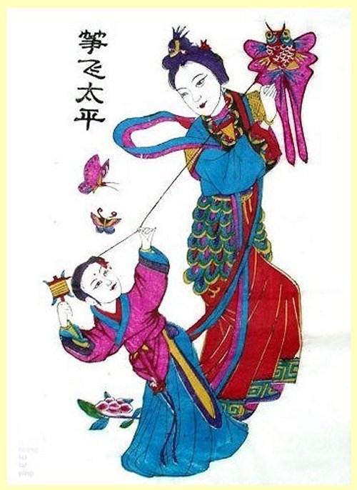 年画在中华随处可见。 农历新年到来之际,中华人的家家户户的门口都会贴上新鲜的年画和新的字画, 上面写着格言、诺言和美好祝愿,都是驱邪或祝新的一年好运之类的。 潍 坊是这些彩色木 刻首次被用来制作风筝的地方。 与丝绸或 纸覆盖的三维竹体相结合,所有这些风筝都对所有这些飞行物体产生了非常逼真的印象。 潍坊的风 筝制作者、风筝艺 术家、风筝艺术家世代享誉中外。 这类年画的用色、装饰、布 置等艺术风格是潍坊汉亭区杨 家埠小镇所特有的。 杨家埠以其风筝制作者和艺 术家而闻名于世。 甚至还有一套新年图片 邮票, 庆祝英家埠及其美术。 杨家埠年画的例子是我网上 收藏的一部分。 放风筝的儿童画是中国 画和其他美术中常见的题材。 看看我在线收藏的风 筝陶瓷和风筝剪纸吧。 在“百子”这一古典主题的艺术作品 中,经常会看到放风筝的孩子。 甚至还可以找到刺绣图片。 你甚至可以在佛教寺庙 中找到风筝,主要供奉观音。 观音是观世音菩萨的女性版本,观世音菩萨是广受欢迎的观世音菩萨,是妇女、儿童和航海人士的守护神。 日文版名为"かんのん" (拼音:“堪能” "kan neng")。 |