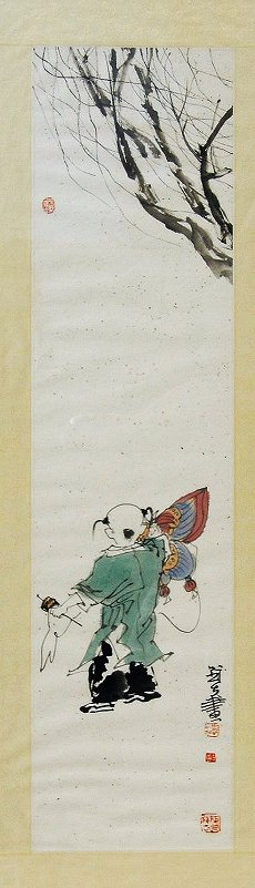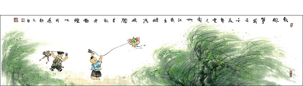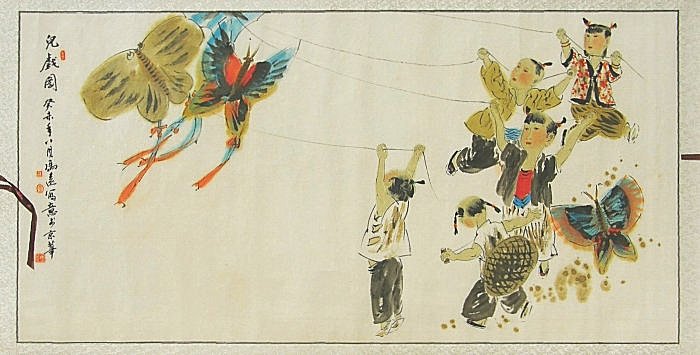 Fang FengZheng Drachensteigen Flying Kites von / by YANG LiuQing (Papier-Tusche, Rollbild, Brokat-Rand / paper-ink, paper-scroll, brocade selvage) 26 X 63cm 2005 (TianJin) |