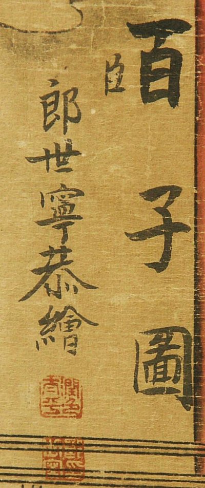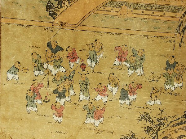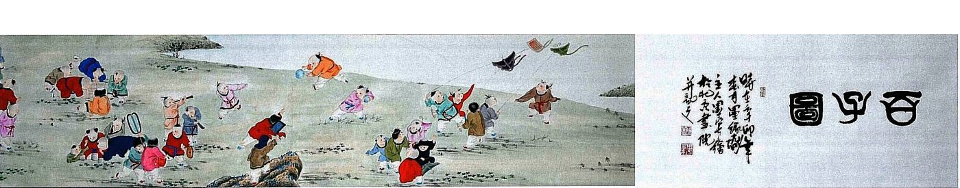 BaiZi (100 Jungen / 100 Boys) (Leinwand-Tusche, Rollbild, fruehes 20. Jh. / canvas-ink, canvas scroll, pre-republican) 63 X 119cm Detail 1 (Drachen / kite) Detail 2 (Bildzeichen / mark) Variante des Bildes aus neuer Zeit Modern version of this canvas scroll |
