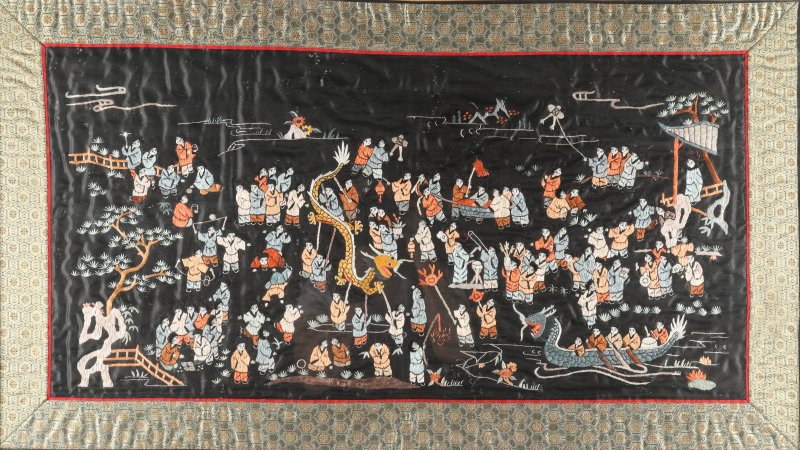 Kindern bei verschiedenen Aktivitäten wie Drachenbootfahren, Drachenfliegen und einem Neujahrsumzug / Children engaged in various activities such as dragon boating, kite flying, and a New Year's parade Seidenstickerei / Silk Embroidery / 刺绣画 49 X 87 cm frühes 20. Jahrhundert / early 20th century |