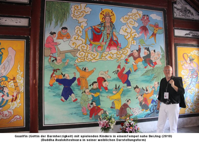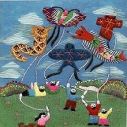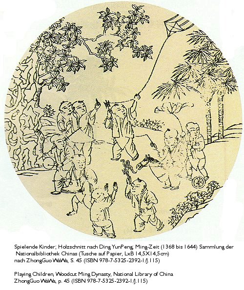 abzuhalten und ein frohes Jahr zu gewaehrleisten. In WeiFang wurden die zunaechst als Holzschnitt gedruckten bunten Bilder und Zeichnungen zum ersten mal auch auf Drachen appliziert. Auch die Gestaltung der Drachen aus mit Seiden-Papier bespannten Drachen-Koerpern wurde hier zur Bluete gebracht. In Verbindung mit den dreidimensionalen Koerpern, wirkt die einzigartige Bemalung auf den fliegenden Drachen ausserordentlich lebensecht und ergibt besonders bei den Tierdarstellungen ein realistisches Flugbild. Drachen aus WeiFang sind seit Generationen im In- und Ausland beliebt, und werden daher auch in alle Welt exportiert. Der kuenstlerische Stil der Bemalung und Ausgestaltung der Neujahrsmalerei wurde massgeblich von YangJiaBu beeinflusst. YangJiaBu ist das Drachenbauer- und Kuenstler-Dorf im Kreis HanTing der Stadt WeiFang. Sogar eine offizielle Chinesische Briefmarken-Edition mit den Neujahrsbildern aus YangJiaBu gibt es. Neujahrsmalereien mit Drachen-Motiven gehoeren ebenfalls schon immer zum Repertoire. Einige Beispiele sind in meiner kleinen Online-Sammlung zu finden. Bilder mit drachenfliegenden Kindern, sind seit vielen Jahrhunderten haeufiges Sujet in der Malerei und anderen Kunstgattungen (siehe hier auch auf den Webseiten unter Keramik, oder Scherenschnitten). Auch als Stick-Bilder sind sie zu finden. Oft findet drachenspielende Kinder auch im klassischen Sujet der "Einhundert Kinder" (BaiZi). Kinder mit Drachen sind sogar Tempeln zu finden, meist in buddhistischen Tempeln, die der Verehrung von GuanYin geweiht sind. GuanYin ist die weibliche Darstellung des Buddha Avalokiteshvara, die als volkstuemliche Goettin der Gnade, als Schutzpatronin der Frauen, Kinder und Seefahrer bekannt ist. Die japanische Bezeichnung hierzu lautet Cannon. |