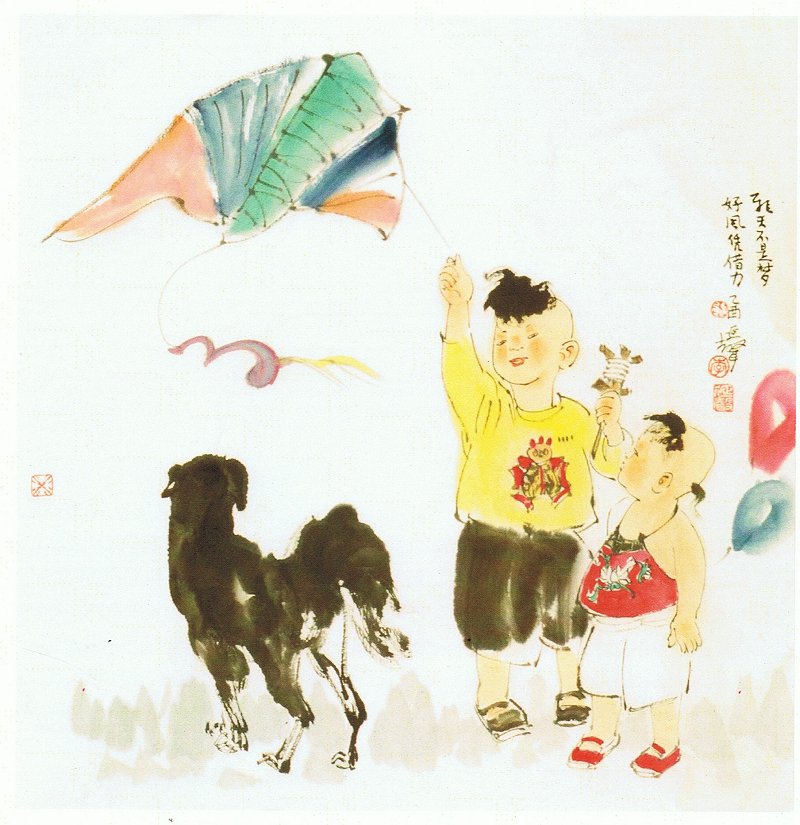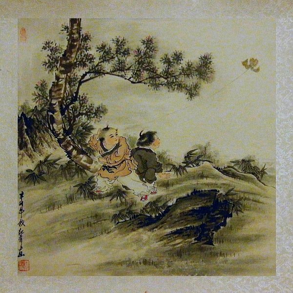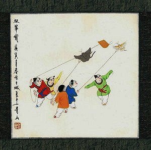 Drachensteigen Kite Flying (Seidenmalerei mit, Brokat-Rand / silk painting with brocade selvage) 12.7 X 17.8cm (ohne Brokat-Rand / without selvage) 1980 (TianJin) |