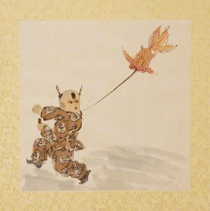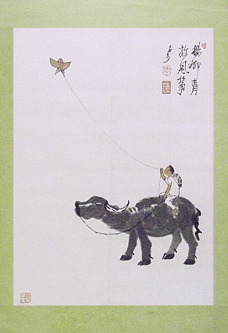 Drachensteigen auf dem Wasserbueffel Kiteflying on the Back of a Water Buffalo Tusche, Papier, Brokat-Rand ink, paper, brocade selvage 60 X 84cm (Kopie / copy ca. 1999) von Li KERAN (BeiJing) vergleiche / compare : Postkarte / postcard Briefmarken / stamps Lunar-Kalender / Lunar Calendar |