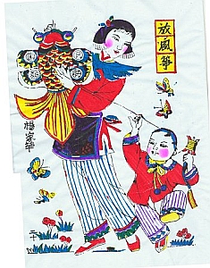 Fang FengZheng Drachensteigen Kite Flying (Neujahrsbild, Holzdruck / woodblock print) 34.5 X 45.5cm 2000 YANG LuoShu (YangJiaBu, WeiFang, ShanDong) Variationen / Variations |