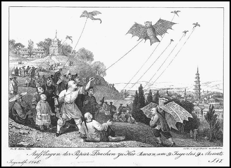 Drachen zu Hae-kwan, am 9. Tage des 9. Monats." "Flying Paperkites during the Hae-Kwan Festival on the 9th Day of the 9th Month" (Stahlstich / steel engraving) 9.5 X 14.5cm (Original aus "Der Jugendfreund" 1846) Deutschland (Germany) Original von / by Thomas Allom (1804-1872) |