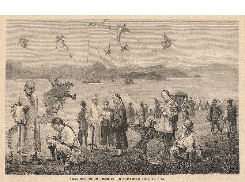 Papierdrachen am Feste Ching-yaong in China" "Flying Paperkites during the Ching-Yaong Festival" (Stahlstich / steel engraving) 15 X 22cm 1885 Deutschland (Germany) |
