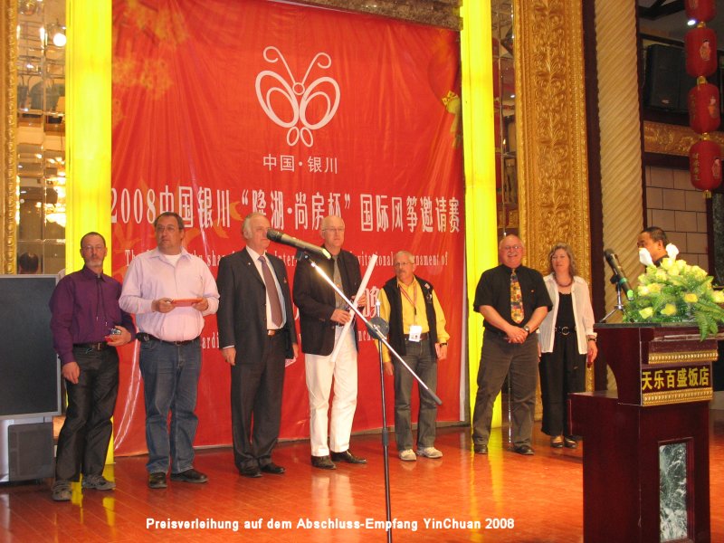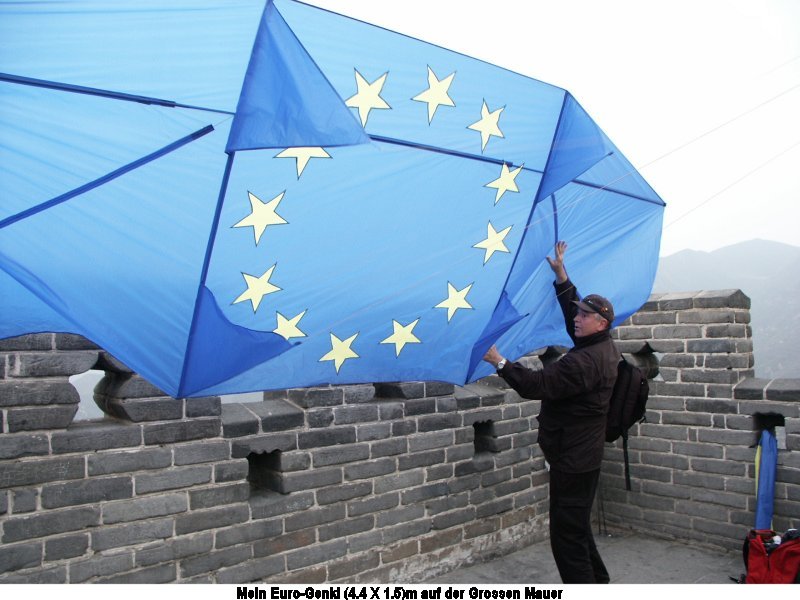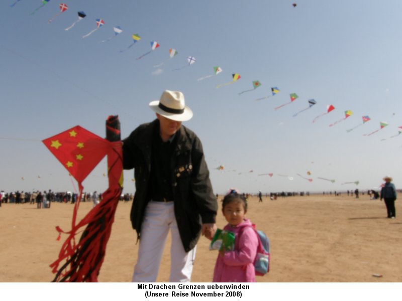 Das Festival ist wird wieder mit Feuerwerk, Konfetti und Paraden eroeffnet und erinnert schon fast an eine kleine Olympiade. Die Freude daran teilzunehmen zaubert immer wieder ein Laecheln hervor.Drachensteigen in der Wueste selbst, ist bereits ein unglaubliches Raum-Erlebnis. In der Umgebung von YinChuan laufen mehrere Straenge der Grossen Chinesischen Mauer zusammen. Viele Teile der hier uberwiegend aus den Ming-Zeit stammenden Grossen Mauer sind noch zu besichtigen. Die Grosse Mauer hat hier einen voellig anderen Charakter als die ublicherweise bei BeiJing zu besichtigenden Abschnitte aus der Qing-Dynastie. selbst ein komplettes in Hoehlen gebautes Ming-Fort am Rande eines Canyons sind zu besichtigen. Drachensteigen in der Wueste ist sicherlich auch ein besonderes Erlebnis! Planung des Reiseverlaufes (2011) Aenderungen des Programms sind moeglich. 22. Mai 2011 (So) Abflug in Deutschland, Flughafen Frankfurt oder Muenchen Wir fahren mit der Bahn von unserem Wohnort nach Muenchen oder Frankfurt. Fly and Rail sind im Paket inbegriffen. Wir treffen uns am Abflugschalter (Linienflug). Der Flug geht durch die Nacht hindurch. Am fruehen Vormittag des naechsten Tages, kommen wir in China an. 23. Mai 2011 (Mo) Ankunft in BeiJing Ankunft am Flughafen. "Ni hao“ begruesst uns die Hauptstadt Chinas auf Hochchinesisch, das auch Mandarin oder PuTongHua genannt wird. China ist der bevoelkerungsreichste Staat der Welt. Am Flughafen werden wir bereits erwartet und nach dem Auschecken mit dem Bus in unser Hotel gebracht. Je nach Kondition findet nur der Hotel-Check-in statt, oder vielleicht auch noch die eine oder andere Entdeckung. 24. Mai 2011 (Di) Besichtigungsprogramm Die Olympiade hat in dieser Metropole ihren architektonischen Eindruck hinterlassen, vieles ist noch ultramoderner geworden, aber es gibt auch immer noch die kleinen versteckten Winkel, in dem das von uns klischeehaft erwartete alte China zu finden ist. Aber auch das von den meisten wohl gaenzlich Unerwartete ist hier zu finden. Wir hoffen in einem der letzten Alt-Chinesischen HuTong-Hotels unterzukommen. Hoffen wir, dass die Reste des alten BeiJing der Welt und auch den immer bewusster werdenden Chinesen erhalten bleibt. 25. Mai 2011 (Mi) BeiJing, weiteres Besichtigungsprogramm Es gibt wenig Orte auf der Welt, wo eine aehnliche Ansammlung von kulturhistorisch bedeutsamen Staetten oder Bauwerken zu finden ist. Fast schon Weltkulturerbe bis zum Abwinken. Gleichzeitig ist BeiJing einne moderne MegaMetropole. Wir besichtigen den Platz des himmlischen Friedens (TianAnMen), Kaiserpalast, oder Himmelstempel, die alle zum UNESCO Weltkulturerbe gehören., und kommen bestimmt auch an den Ikonen der letzten Olympiade vorbei. 26. Mai 2011 (Do) BeiJing, ggf. Besichtigungsprogramm, Einkauf und anderes Moeglicherweise besuchen wir einen Markt, wo Drachenhaendler zu finden sind, oder wir besuchen einen der vielen anderen Maerkte um eine Chinesische Porzellanvase, einen Holzdruck, eine Tuschezeichnung oder einen Wandbehang mit Drachenmotiven zu erstehen. Oder wir besuchen den LuBan-Tempel in Beijing, den Tempel des Schutzpatrons der Drachenflieger, den fast kein Reiseleiter kennt, weil er seit 20 Jahren versteckt liegt, oder, oder...... 27. Mai 2011 (Fr) Weiterflug nach YinChuan. Training ggf.Besichtigungstour Am Flughafen werden wir bereits erwartet und nach dem Auschecken mit dem Bus und Begleitfahrzeug in unser Hotel gebracht. Je nach Kondition findet nur der Hotel-Check-in statt, oder vielleicht auch noch die eine oder andere Entdeckung.ggf. Training und/oder wir lernen unser Wettbewerbsgelaende kennen, koennen Probefliegen, und dann gibt es eine Besichtigungstour, die entweder in den ShuiDongGou-Canyon, zu den Sandduehnen, oder den Xi-Xia-Pyramiden fuehrt. In jedem Fall fallen wir nach dem Abendessen in gepflegter Umgebung totmuede ins Bett 28. Mai 2011 (Sa) Eroeffnungszeremonie, Wettbewerb (YinChuan) Nach dem Fruehstueck geht es zum Wettbewerbsgelaende, und nehmen an der Eroeffnungszeremonie teil. Nach der feierlichen Eroeffnung finden die ersten Wettbewerbe statt. Da Chinesische Drachen und Wettbewerbe anderen Kategorien angehoeren als bei uns oft ueblich, fallen wir meist in die Gruppe der "Kite-Performance", was dass auch immer jeweils bedeuten mag. Ehrgeiz ist zwar angesagt, aber es geht hauptsaechlich um den Spass-Faktor und die Voelker-Freundschaft. Wer Besonderheiten dabei hat, wird auch besonders gewuerdigt! Genauere Informationen im Rahmen der Anmeldung und Informations-Schreiben, oder fuer die, die ganz sicher eine Goldmedallie haben wollen, auch vorab telefonisch.. 29. Mai 2011 (So) Wettbewerb, Preisverleihungs-Zeremonie (YinChuan) Vormittags gehen die Wettbewerbe weiter, und Nachmittags gibt es dann eine Preisverleihungs-Zeremonie mit einem Fest-Gelage als kroenenden Abschluss des Festivals. 30. Mai 2011 (Mo) Abflug nach BeiJing, Weiterflug nach Deutschland, Ankunft in Deutschland und Rueckfahrt mit der Bahn zu unseren Wohnort. Aenderungen vorbehalten
