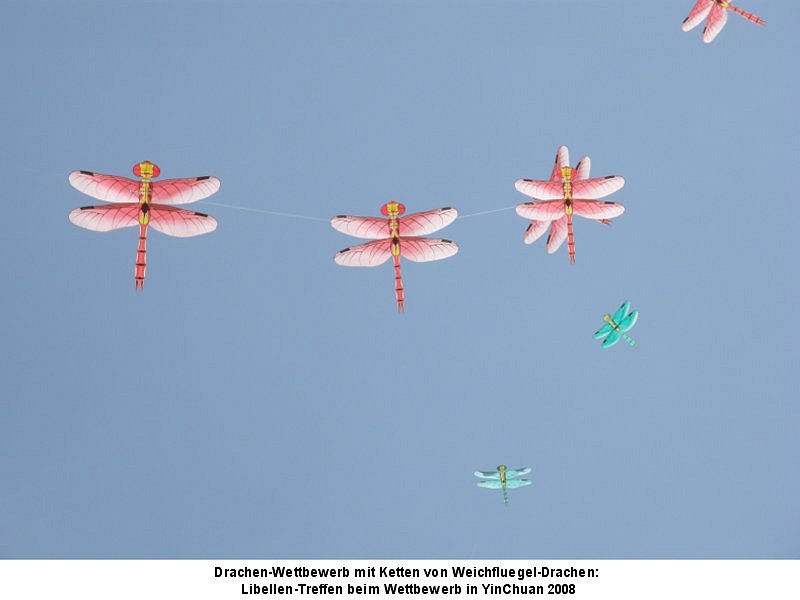 Auf besondere Einladung werden wir dieses Jahr am Internationalen Drachenfest in YinChuan teilnehmen. Die Kosten betragen lediglich 600 Euro pro Person. Aber nur für Drachenflieger (Sponsoring). Eingeschlossen sind internationale Fluege, innerchinesische Fluege, Verpflegung und Uebernachtung. Absolute Voraussetzung: der Teilnehmer muss ein DRACHENFLIEGER sein. Nichtdrachenflieger koennen uns in begrenzter Zahl begleiten muessen jedoch 1300 Euro zahlen. YinChuan liegt im Norden Chinas im Autonomen Gebiet der Hui-Minderheit in NingXia am Oberlauf des Gelben Flusses. NingXia ist eine der vier Autonomen Regionen Chinas und liegt zwischen den Provinzen Shaanxi , Gansu, und der Inneren Mongolei. YinChuan, woertlich 'SilberFluss', ist die Hauptstadt von NingXia, hat etwa ein Million Einwohner und ist zur noerdlich gelegenen Inneren Mongolei hin, durch die HeLan-Berge gegen den kalten Wind der Gobi geschuetzt. YinChuan ist die Hauptstadt der Autonomen Region der Hui. Die Hui sind eine der 56 Nationalitaeten Chinas und muslimischen Glaubens, aber ausser der sie einigenden Religion gibt es keine ethnisch begruendeten Gemeinsamkeiten die den Status einer Nationalitaet rechtfertigen wuerden. Die wird ihnen in Taiwan daher auch nicht zugestanden. In YinChuan sind mehrere groessere moderne und historische Moscheen zu finden. YinChuan ist