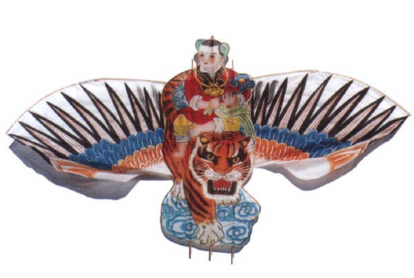 Das Tiger reitende Kind (gefluegelte Ausfuehrung) The Tiger Riding Child (winged version) 120cm x 60cm Der Tiger ist das Symbol fuer Tapferkeit und Staerke. Er ist im Chinesischen Tierkreisszeichen das 3. Himmels-Symbol. In der Hand haelt das Kind ein RuYi-Szepter, ein gluecksverheissendes Symbol, das auch fuer Staerke und Macht stehen kann. Weitere Variationen des Themas finden sich bei den Hartfluegel-Drachen. Das Mittelteil des abgebildeten Drachen entspricht einem klassischer Hartfluegel-Drachen. Die angesteckten Fluegel (Weichfluegel) aendern nichts an dieser Klassifikation _____________________________________________________ The tiger is a symbol for bravery and strehth. Within the Chinese zodiac, it represents the third house. The child holds a RuYi within its hands. The RuYi is an auspicious symbol of strength and power. More variations of this topic are to be found within the section of Hardwing Kites. The center part of this kite represents a genuine hardwing kite. The interlocked wings (softwings) do not alter the classification. weitere Drachen / more kites Copyright 2002 ff: Hans P. Boehme |