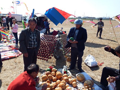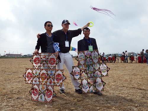 南通口哨 风筝 5组48个口哨 南通吹口哨的风筝已有一千多年的历史了。风筝本身是带有刚性竹框架的扁平风筝。设计由几何正方形和矩形形状的组合组 成。风筝通常以“八 卦”风格制作。面料传统上是用丝绸制成的。风筝帆的前部是一个机架,该机架带有经过精心选择的不同音哨组成 的组合。口哨通常由葫芦和/或竹子制成。由于大口 哨,这些风筝往往很重。因此,它们通常仅在强风和高空飞行。通常,您可以听到特征性的声音而无需先注意 到风筝本身。传统上,风筝是用编织的粗麻绳飞行的(请参见上图)。通常为了稳定风筝,将两条长长的麻绳等距对称地应 用在尾巴上。更多图片:风筝制作人的仪式移交; 在南通如东小杨 口节期间在飞行场上南通市崇川区风筝协会风 筝博物馆(2013年),收藏着全球最大的口哨风筝 |