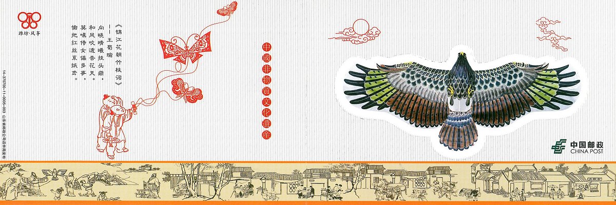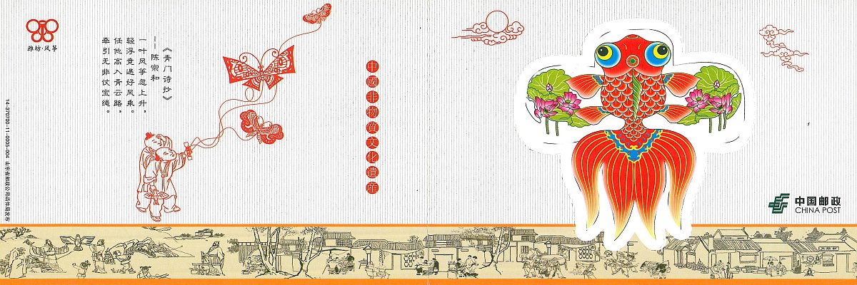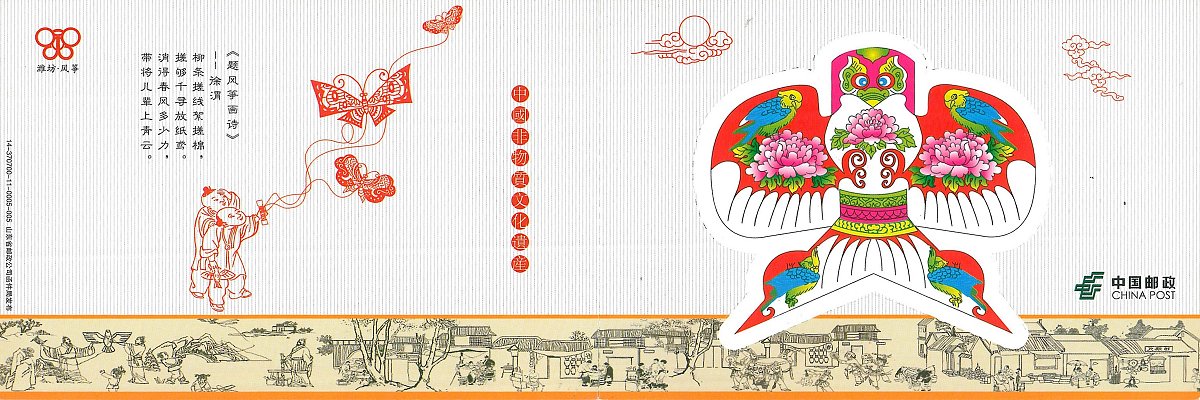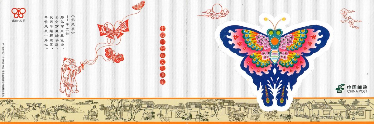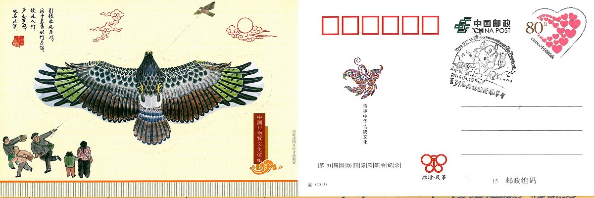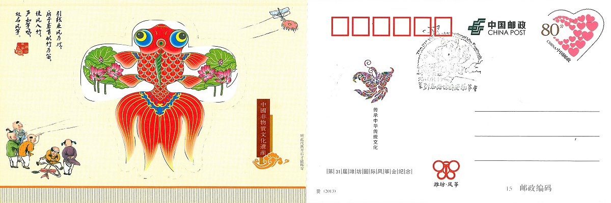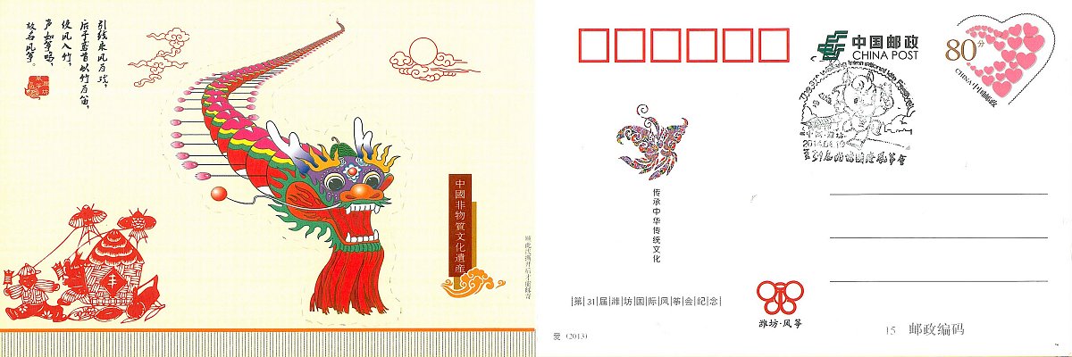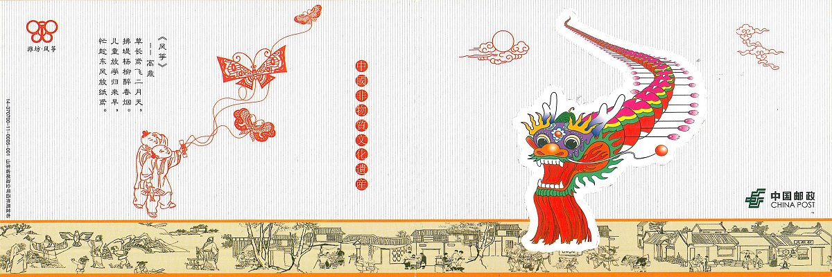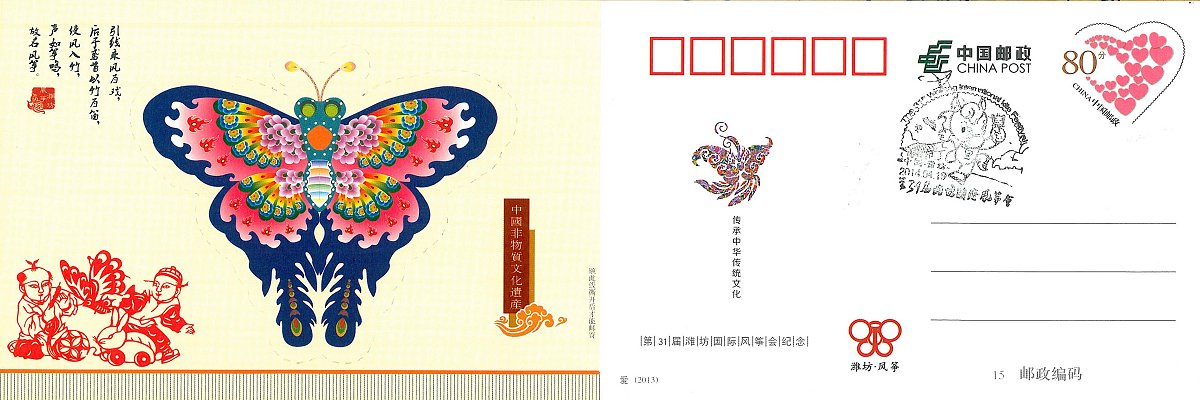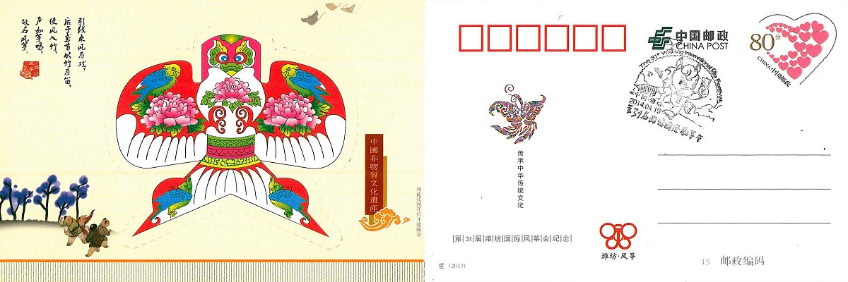 Drachenfest erhaeltlich. This picturecard set contains a series of five official double postcards of classical traditional kites. The postcard set is officially produced by the Chinese Postal Administration (China Post), and is an official postal stationary with a nominal value of 80 Fen for the inner Chinese service (postal stationary, but without imprinted "kitestamp"). The set was available at a special postoffice directly at the festival venue. This set has a cancellation with the festival logo and the official postal stamp in commemoration of the "Year of the Horse 2014". Bilder anklicken zum Vergroessern! / Click to enlarge! Bilder anklicken zum Vergroessern! / Click to enlarge! |