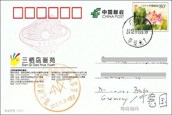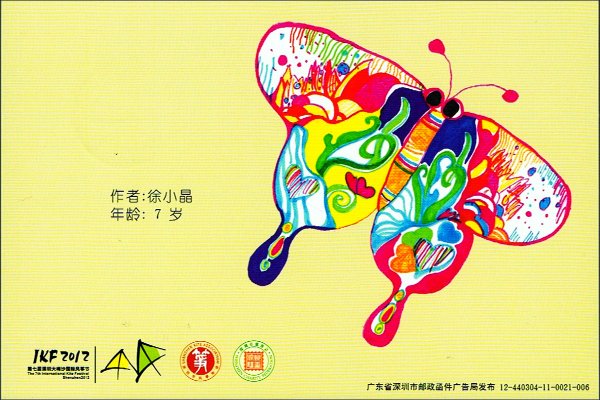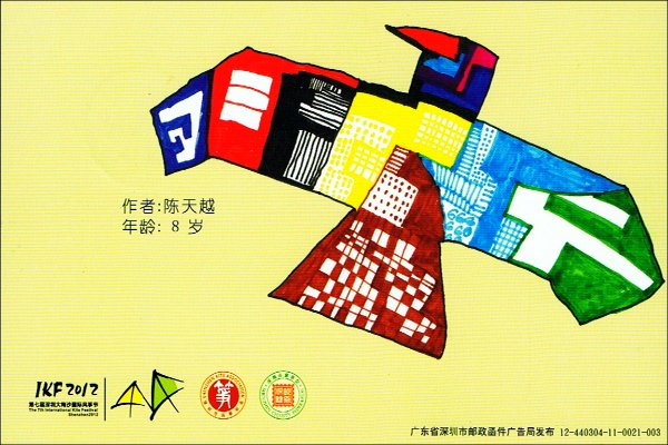 Wohlfahrtsprojekte verbunden. This picturecard set contains a series of childrens drawings of kites, following a competition. The pictures are from the winning set. The postcard is officially produced by the Chinese Postal Administration (China Post), and is an official postal statonary for the inner Chinese service (postal stationary, but without imprinted "kitestamp"). The set was available at a special postoffice on the beach of DaMeiSha, directly at the festival venue. This set has a cancellation with the festival logo and the official postal stamp. Bilder anklicken zum Vergroessern! / Click to enlarge!