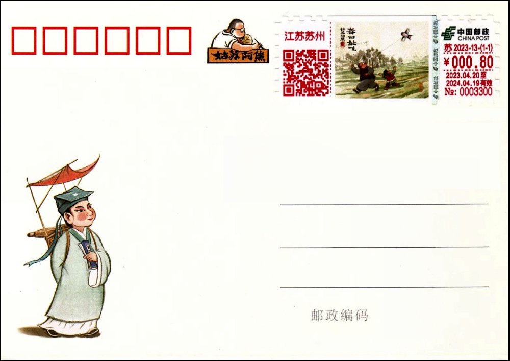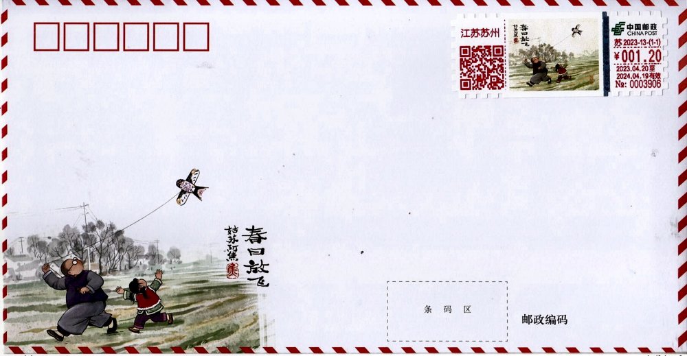 Die gleiche Lokalausgabe der ATM mit Postkarten-Porto. ___________________ ATM stamp, local issue JiangSu with postage 1.20 yuan. ("Kite Flying on Spring Day") The same local local ATM with postcard postage. ___________________ ATM邮票,江苏本地发行,邮费1.20元《春日放飞》。 相同的当地 ATM 邮票与明信片邮资。 |
