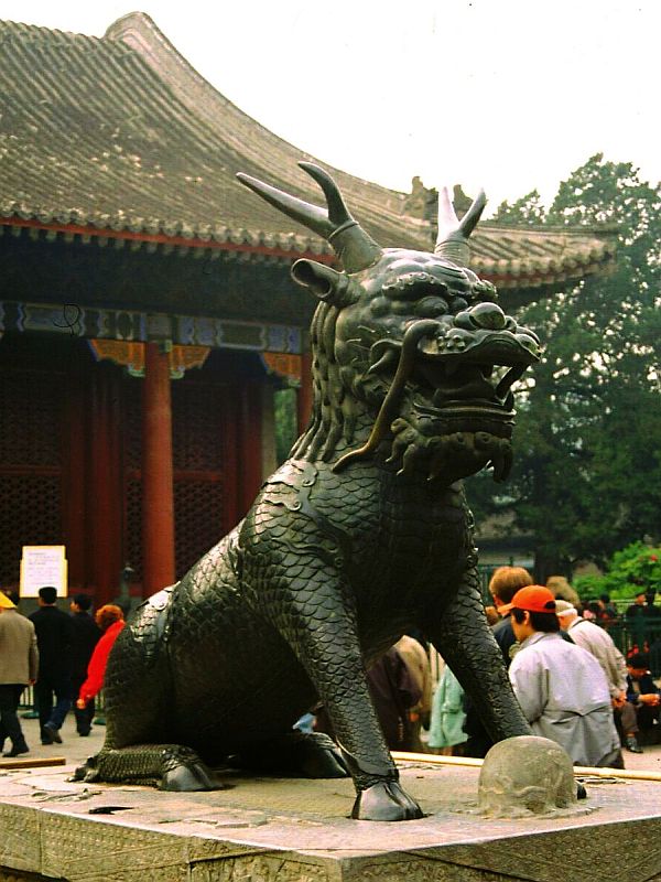 The Yellow Emperor, is the legendary emperor, who is said to have witnessed the beginning of the Chinese culture. HuangDi is counted for group of Chinese Arch Emperors. He is a divine and mythical figure that during the Zhou period (1045-770 v. Chr.) was historicized as one of the ancestors of Chinese history . He belongs to the legendary first five emperors, and is said to have ruled from 2696-2598 v. Chr.. The Yellow Emperor was originally a god of war, and gradually changed throughout history to be an enlightened immortals of Taoism. He is depicted as a conqueror, judge, immortal, god of KunLun, the world mountain and the center of earth. His mother was pregnant with lightning in the night sky. After 20 years of pregnancy, Huangdi was born. He was skilful directly after birth, and could talk immediately. The wife of HuangDi is LeiZu (Mother of Thunder); his daughter is NiuBa, the symbol of drought. There are reports of a fight between HuangDi and his brother YanDi concerning a big flood, unleashed by a monster who defeated HuangDi. Likewise, it is reported, HuangDi made a big drum from the skin of Kui, a mythical creature. He used it for making wind, rain and drought. Therefore he is also considered the God of many weather phenomena. Concerning Daoist tradition, he written the most important medical textbook (HuangDi NeiJing). The written principles in the NeiJing (acupressure, physiology, morphology, pathology, diagnosis and Krankheitspraevention, moxibustion, acupuncture and the location of acupuncture points and meridians) are supposed valid until today. Traditional Chinese Medicine (TCM) is currently one of the major Chinese export hits into western "disoriented societies" (Europe, USA). Das QiLin (麒麟) ist ein chinesisches Fabeltier. Neben dem Drachen (Long), dem Phoenix (FengHuang) und der Schildkroete (Gui) zaehlt das QiLin zu den „vier Wundertieren“. Ein besonders schoenes Exemplar ist im Sommerpalast in Peking zu bewundern. In der Ming-Dynastie wurde das Tier mit einem Drachenkopf mit Flammen-Ornamenten und Ochsenhufen, sowie mit Fisch- beziehungsweise Drachenschuppen dargestellt. In der Qing-Dynastie kamen ein Hirschgeweih, ein Loewenschwanz und der Bart eines Karpfens hinzu. Dem QiLin wird eine friedliche Natur nachgesagt und es verkoerpert die Liebe, Frieden und Guete. Es soll ausschliesslich Pflanzen fressen und niemals das Gras zertrampeln ueber das es laeuft oder Kaefer zertreten. In der Wort-Zusammensetzung bezeichnet Qi das maennliche und Lin das weibliche Tier, wodurch der Dualismus, aber auch die Beziehung von Yin und Yang ausgedrueckt werden. Dem QiLin wird nachgesagt, es koenne eintausend Jahre alt werden. Gelegentlich findet man am Eingangs-Portal grosser Banken statt der obligatorischen Waechter-Loewen auch mal ein QiLin-Paar.
