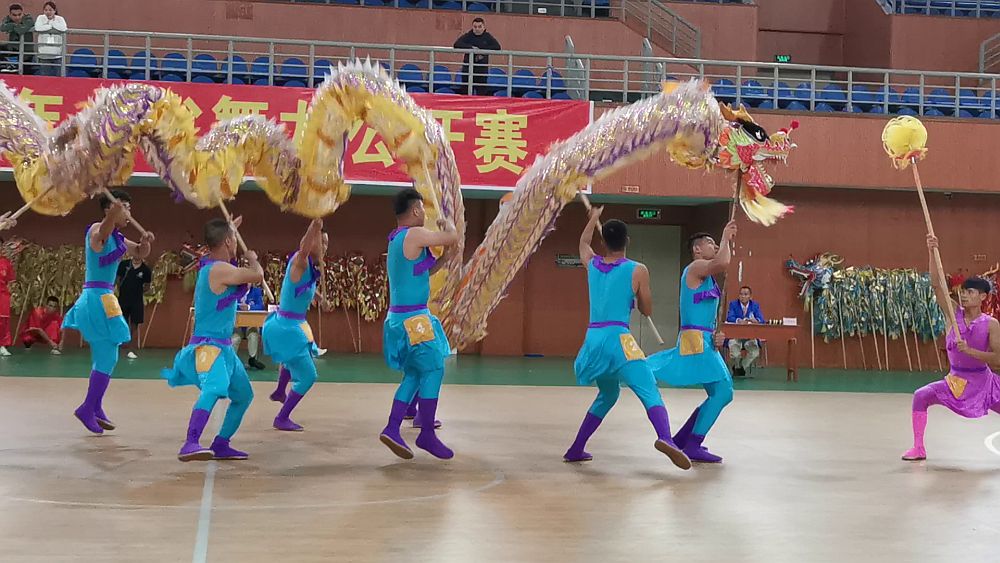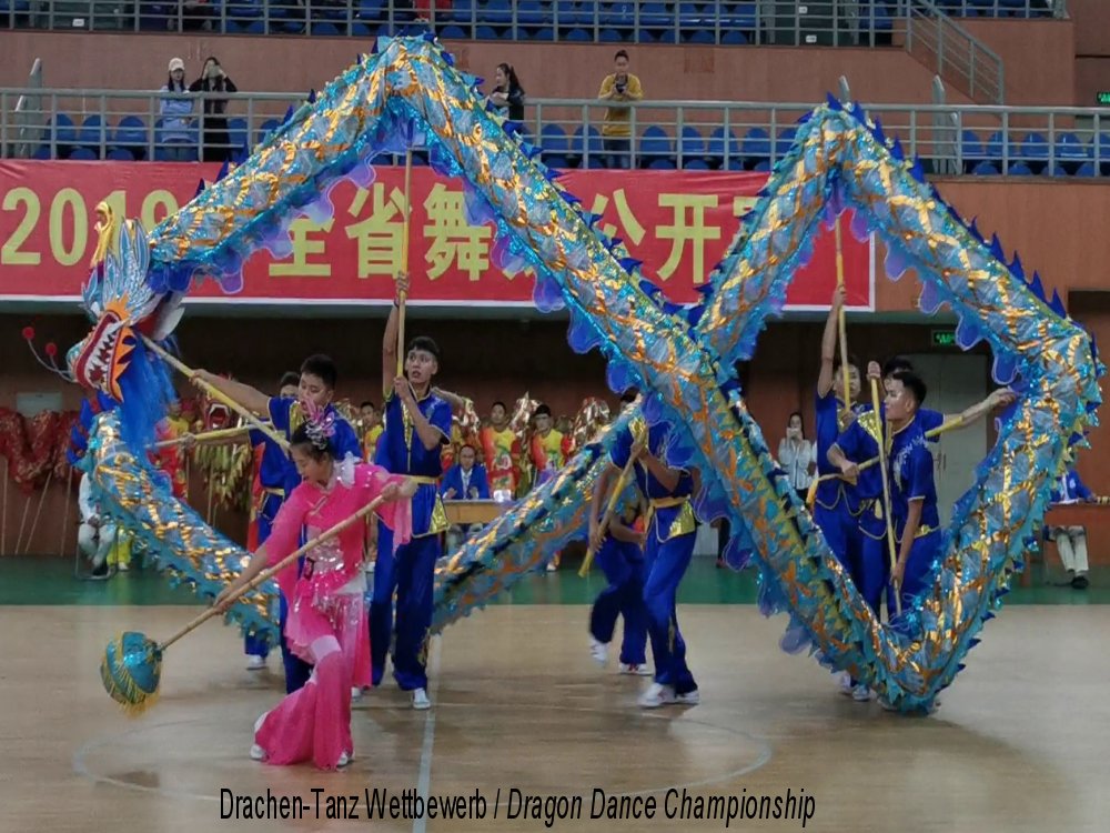 Drachenkoerpers betraegt bis zu 25m. Ein Vortaenzer lockt dabei mit einer auf einem Stock befestigten Kugel ("flammende Perle") den Drachen. Das Tanzteam verfolgt die Bewegung der Perle und simuliert die imaginaeren Bewegungen dieses Fabelwesens indem es mit koordinierten Stock-Bewegungen gewundene und wellenfoermige Bewegungen ausfuehrt. In den entsprechenden Sport-Wettbewerben sind vorgeschriebene Bewegungsmuster und Positionen zu meistern. In den Wettbewerben ist Hochleistungsakrobatik zu sehen, die von lizensierten Schiedsrichtern nach einem ausfuehrlichen Regelwerk bewertet werden. Der Drachentanz wird traditionell waehrend des chinesischen Neujahrsfestes aufgefuehrt. Wettbewerbe werden das ganze Jahr ueber ausgetragen. Je laenger der Drache im Tanz ist, desto mehr Glueck bringt er der Gemeinschaft. Die Bewegungen in einer Auffuehrung symbolisieren traditionell historische Rollen von Drachen, die Macht und Wuerde demonstrieren. _________________________________________________