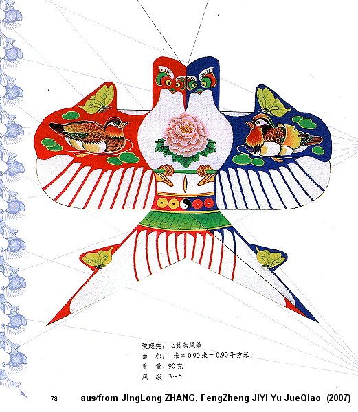 Schmetterling![]() Der Schmetterling ist ein traditionelles chinesisches gluecksverheissendes Symbol, das Frieden, Freiheit, treue Liebe und ein glückliches Leben symbolisiert. Schmetterlinge haben in China eine lange Geschichte. Zhuangzi (ca. 300v.u.Z.) sagte, wenn sich jemand im Traum unwissentlich in einen Schmetterling verwandelt, dann werde er und der Schmetterling eins und vergisst sowohl sich selbst als auch die Welt. Dies Anekdote ist wahrscheinlich der Beginn der chinesischen Schmetterlingskultur. Von da an flatterten bunte Schmetterlinge in die Bilder von Literatur, Musik, und Malerei. Es gibt Tausende von Gedichten über Schmetterlinge in allen Dynastien. Nebeneinander fliegende Schmetterlinge symbolisieren seit der Antike treue Liebe. Eine der vier großen chinesischen Volkslegenden ist "Liang Shanbo und Zhu Yingtai". Das Ende von Liang Shanbo und Zhu Yingtai, die sich nach ihrem Tod in Schmetterlinge verwandeln, ist äusserst tränenreich, was das Bild von Schmetterlingen noch viel schöner macht. In der Volkskultur sind Scherenschnitte von fliegenden Schmetterlingen längst zum Symbol einer harmonischen Beziehung und tiefen Liebe zwischen Mann und Frau geworden. Schmetterlinge stehen auch für Glück und Frieden. In Kombination mit Pfingstrosen implizieren sie hohes Alter und Langlebigkeit. Die Menschen lieben schöne Schmetterlinge, was in vielen ausgegrabenen Kulturrelikten und alten Schriftrollen bewiesen wurde. Schmetterlingsdrachen sind in China sehr beliebt und werden oft bei DIY-Events für Kinder gebaut. Der Rahmen eines Schmetterlingsdrachens ist das ostasiatische Symbol für einen Drachen, so wie der rautenförmige Drachen das Symbol für Drachen im Westen ist. An vielen Strassen WeiFangs, der Drachen Hauptstadt derWelt, findet man Strassen-Laternen, die mit dem Motiv des Geruests eines Schmetterling-Drachens verziert, und sogar nachts illuminiert sind. Selbst Taxis mit diesem Drachen-Sinnbild kann man finden, und auch die Internationale Drachen Foederation (IKF) hat als Logo dieses Drachen-Symbol. ![]() animierte Grafik eines Schmetterlings-Drachens
