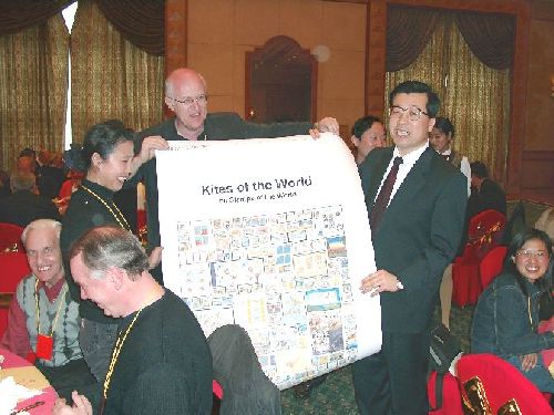The LordMayor of WeiFang receives a poster with kites stamps from all over the world