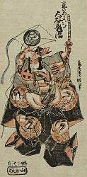 Bishamonten is considered the "chief" of the Four Heavenly Kings and an important figure on his own in Buddhism in Japan, guarding the temples. In Shinto, he is one out of the "Seven Lucky Gods". He is the god of fortune in war and battles, also associated with authority and dignity. He is literally the protector of those who follow the rules and behave appropriately. As the patron of fighters, he is dressed in armour and a helmet, carrying a pagoda in his left hand. He also acts as protector of holy sites and important places and holds a spear in his right hand to fight against the evil spirits. He is usually depicted in illustrations with a hoop of fire. Also refer to 'Seven Gods of Fortune' | ||||