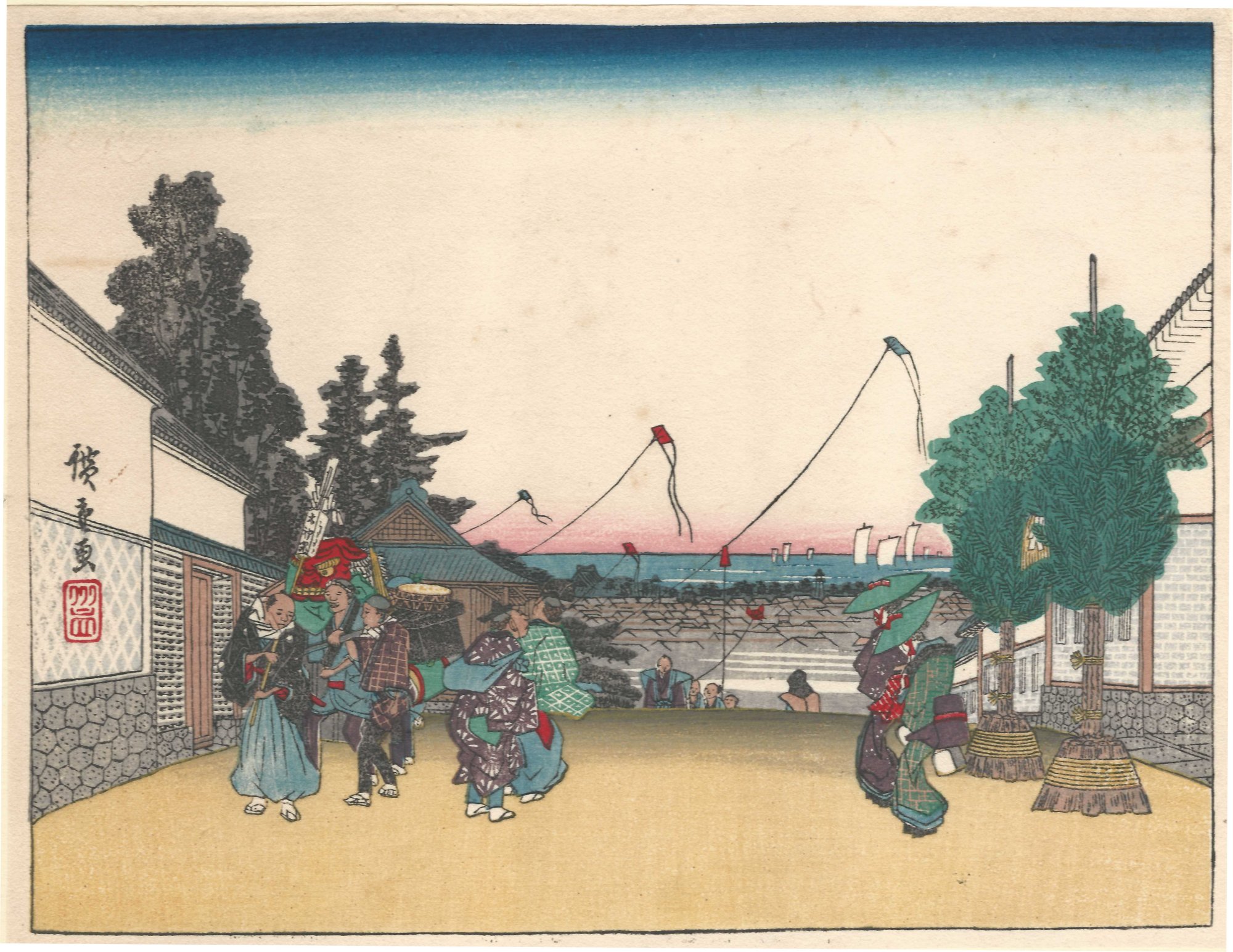 kites ("Edo-tako", "江戸凧") fly overhead. Musicians